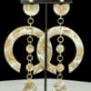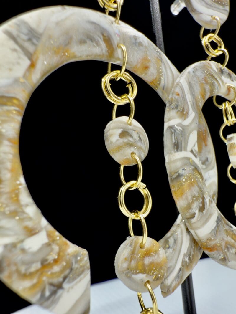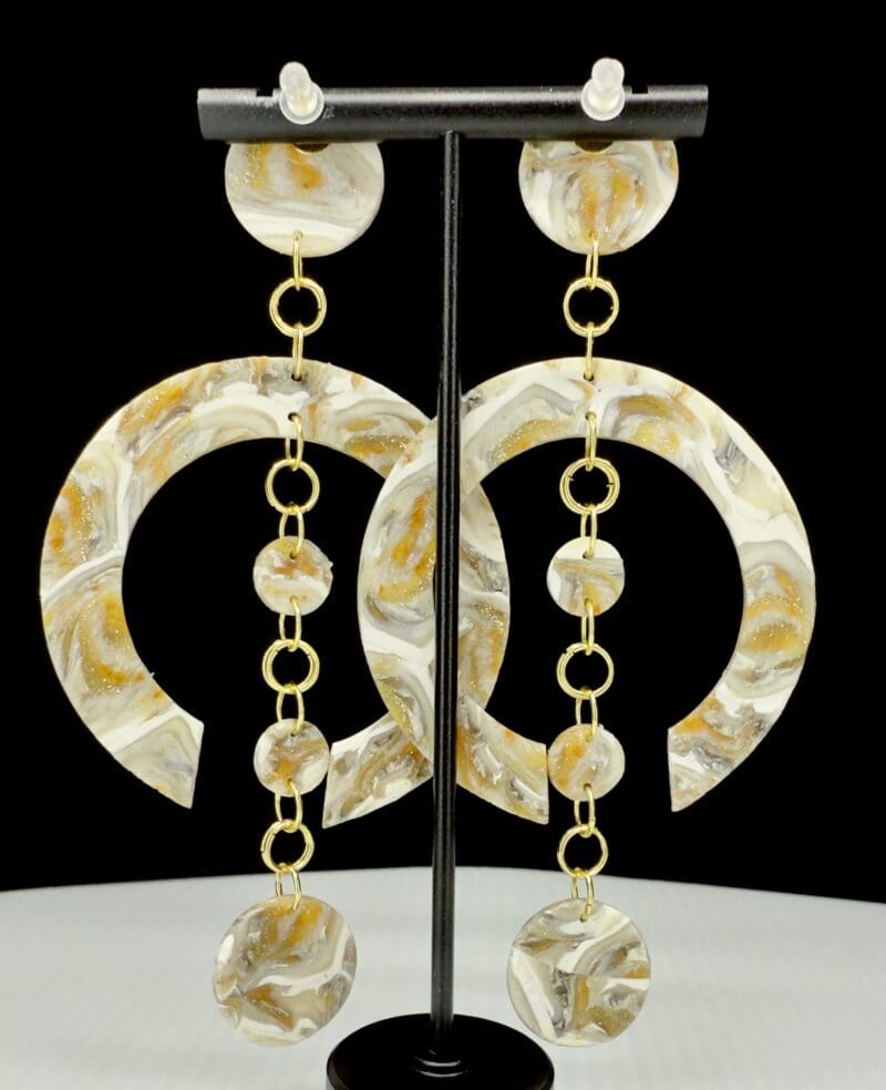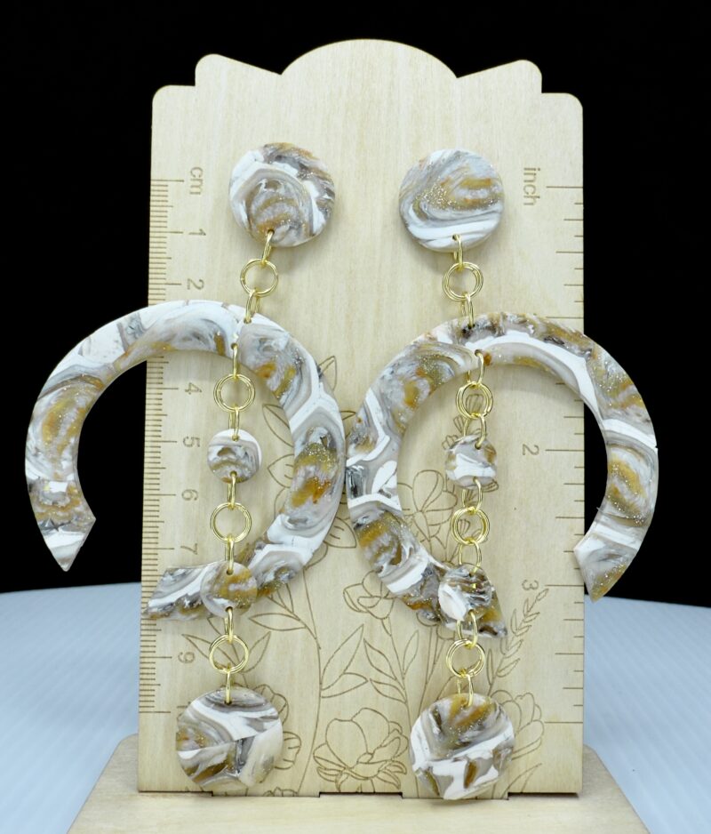 Rustic stone-washed marbling flows through sculptural crescent hoops with cascading circular drops, creating organic movement and architectural depth. The asymmetrical chain elements add motion while maintaining a grounded mineral aesthetic. Lightweight polymer clay construction allows for bold scale without heaviness. As seen on social media: https://www.facebook.com/share/r/1AWN7BKcGs/