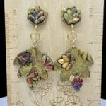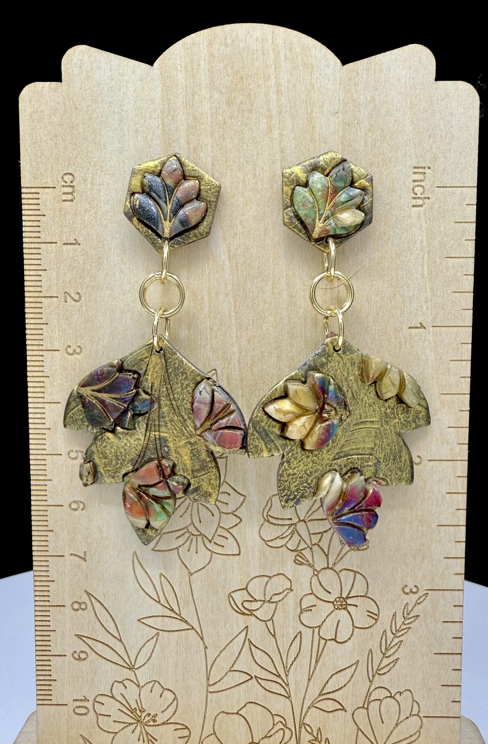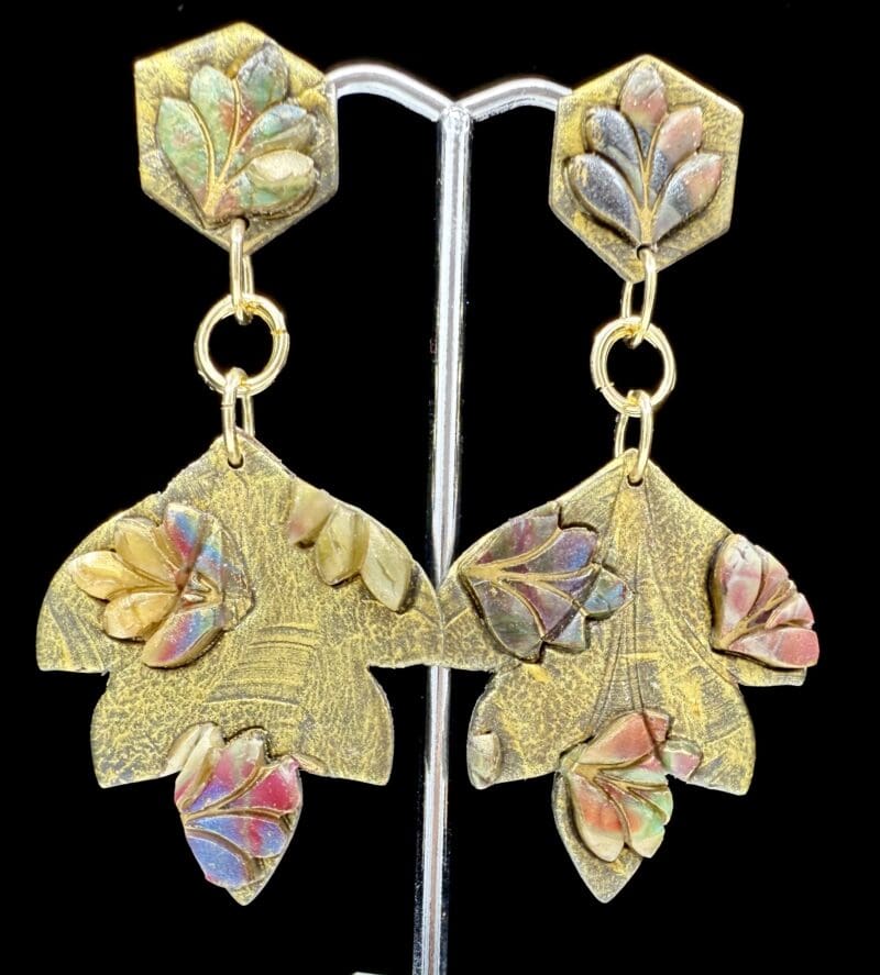 Drop leaf earrings in black clay hand-painted gold with multicolor accents and hexagon post tops. Watch them being made here: https://www.facebook.com/share/v/1H7AsnbD14/?mibextid=wwXIfr
