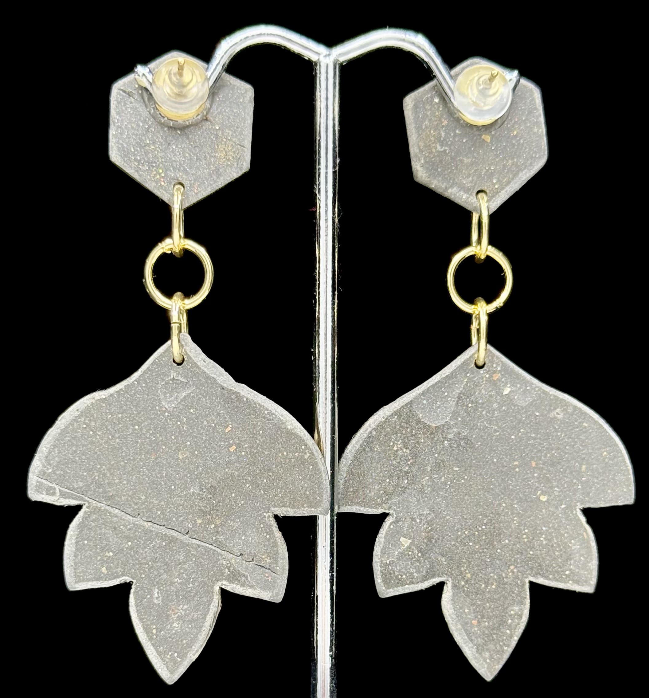The Autumn Harvest Leaves Drop Leaf Earrings feature bold, oversized leaf silhouettes crafted from black polymer clay hand-painted with metallic gold. Layered multicolor appliqués add a natural autumn shimmer, while hexagon post tops with connecting jump rings provide a secure finish. Despite their statement size, they remain lightweight and easy to wear. Each pair is one of a kind, with natural variations in color and placement.