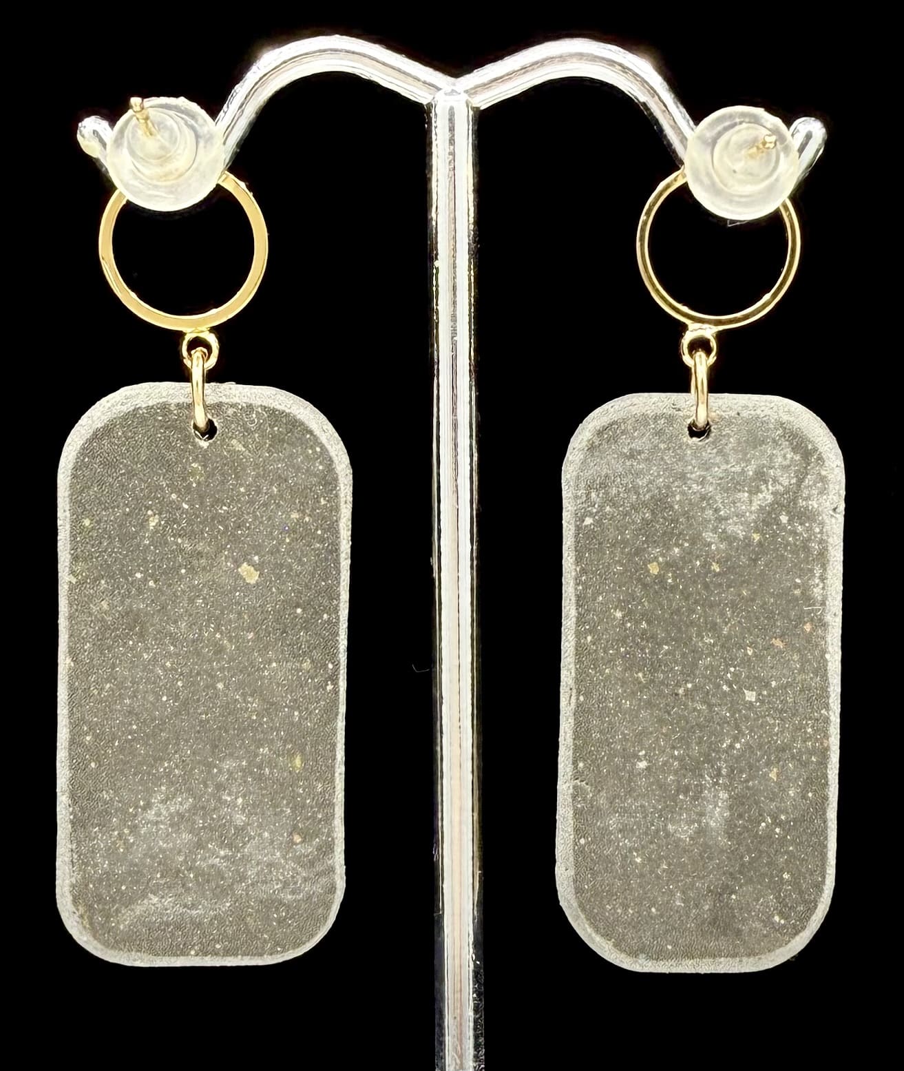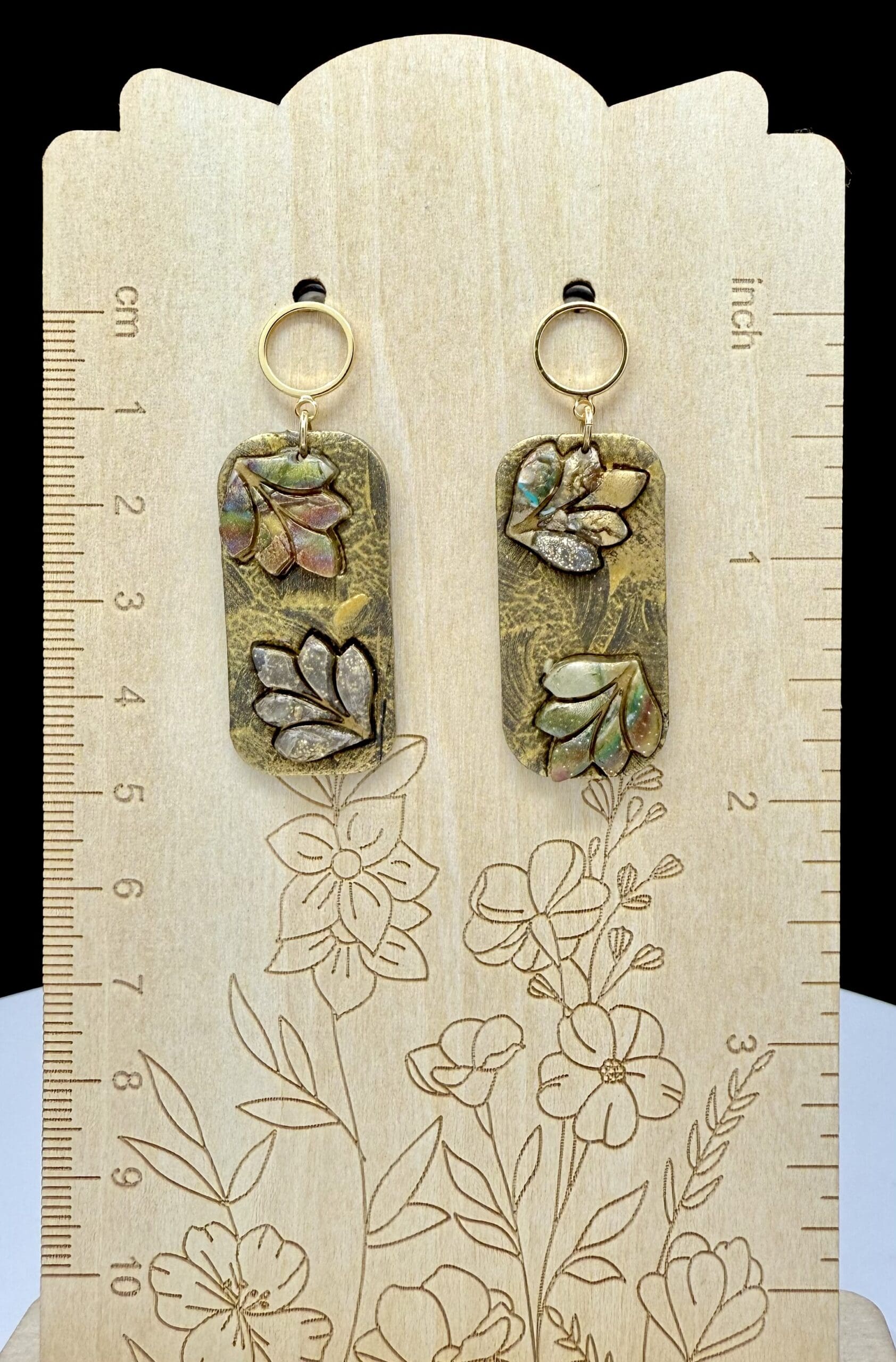 The Autumn Harvest Leaves Rectangular Drop Earrings feature sleek rectangle silhouettes crafted from black polymer clay hand-painted with metallic gold. Layered multicolor appliqués add a natural autumn shimmer, while gold-plated hoops provide a polished, secure finish. Lightweight yet bold, each pair is one of a kind with natural variations in color and placement.