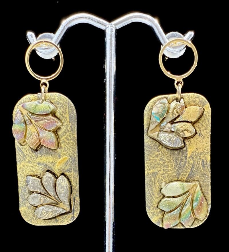 The Autumn Harvest Leaves Rectangular Drop Earrings in black clay hand-painted gold with multicolor accents and gold-plated hoops. See them being made here: https://www.facebook.com/share/v/1H7AsnbD14/?mibextid=wwXIfr