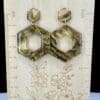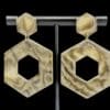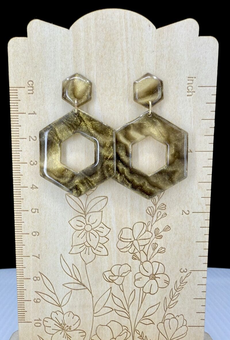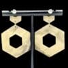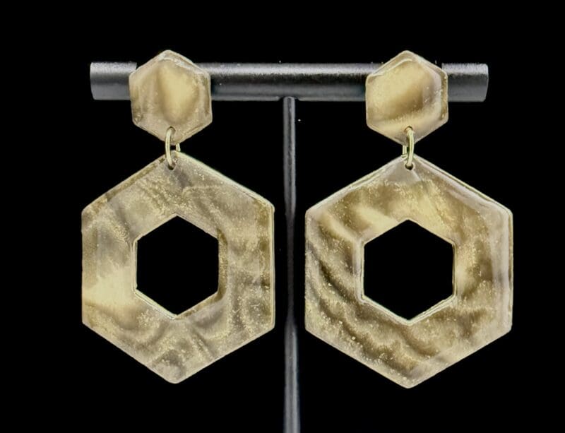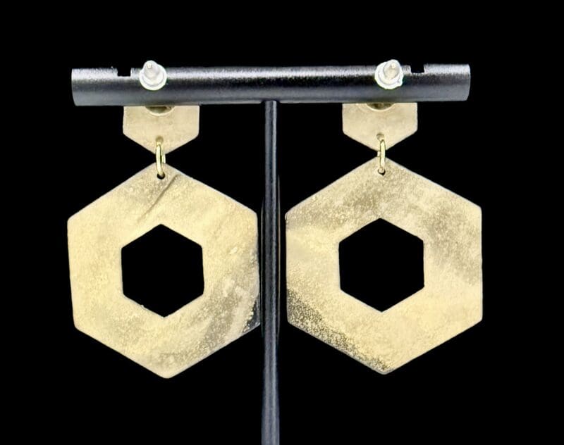 A bold geometric drop featuring layered open hexagon shapes paired with a hexagon stud, finished in a rich black-and-gold palette. The clean angles and open center keep the look architectural while remaining lightweight and wearable for everyday statement styling. See them in the natural sunlight here: https://www.facebook.com/share/r/181LEypBg6/