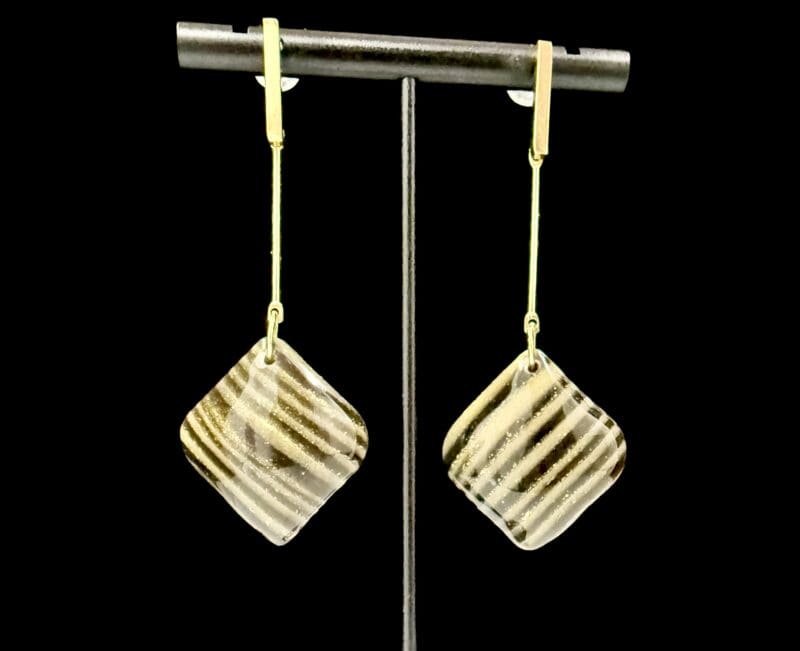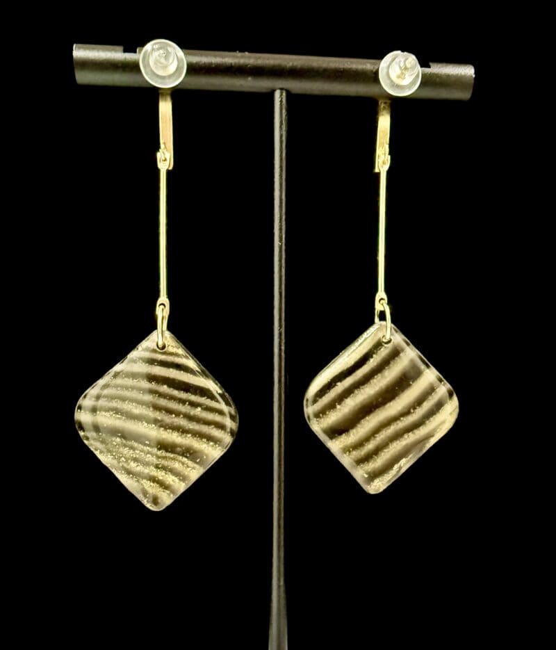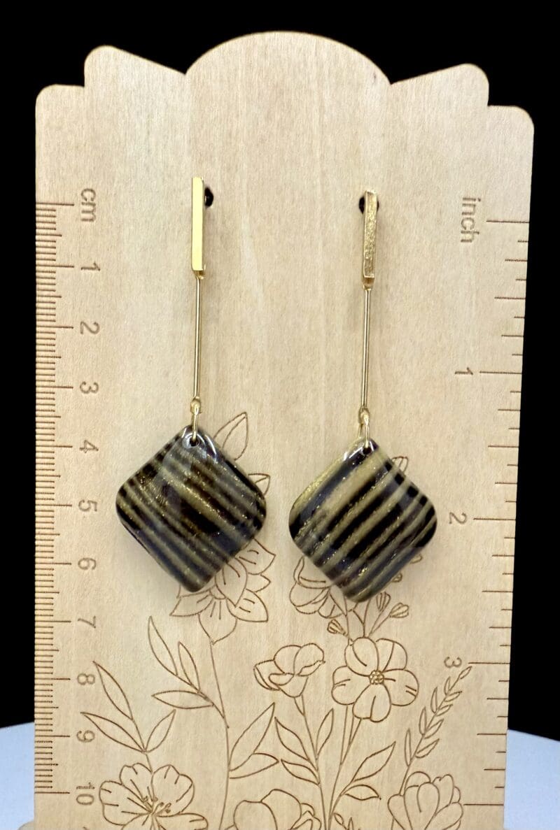 These Black & Gold striped square drops feature deep black and metallic gold layering, creating a bold, polished contrast inside each diamond-shaped piece. The glossy resin finish enhances the shimmer in the gold, giving the earrings a sleek, glass-like shine. See them in the sunlight here: https://www.facebook.com/share/r/1C3GViNAM6/