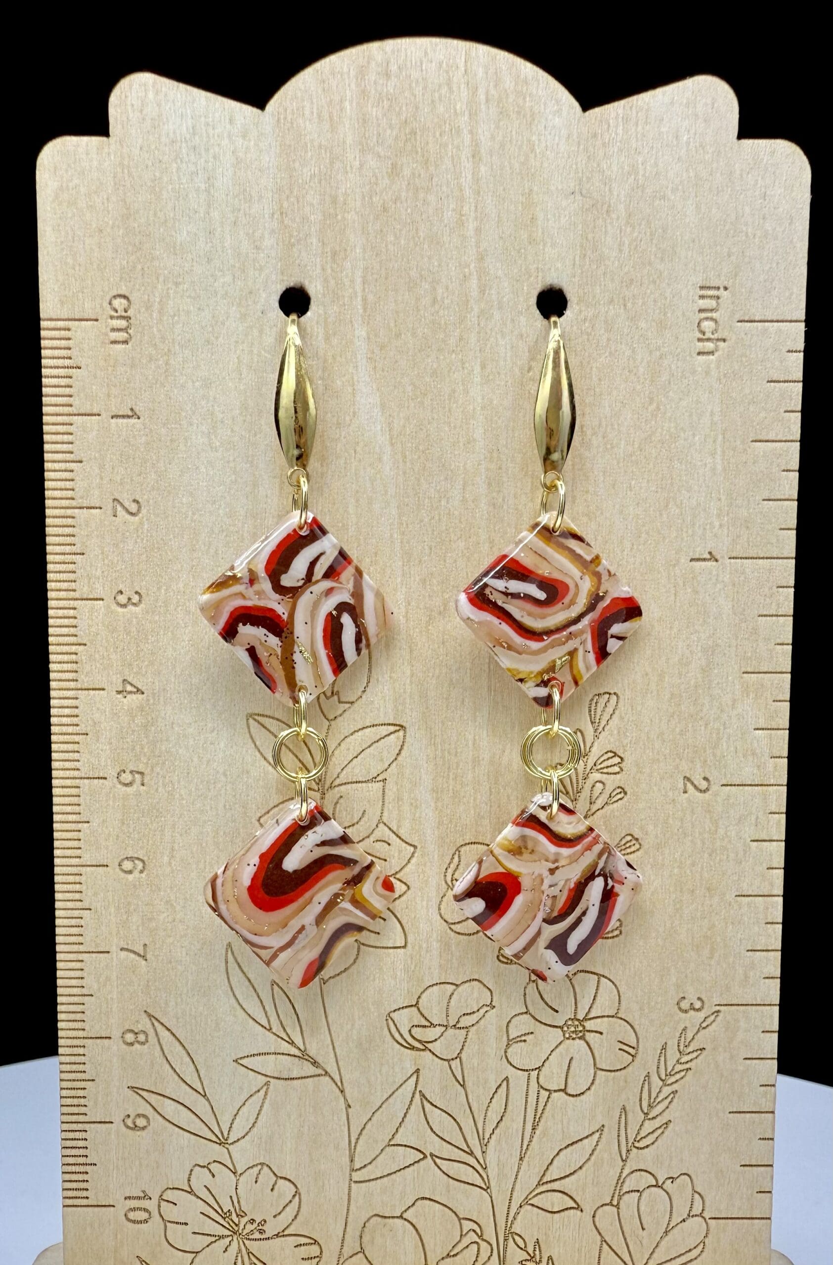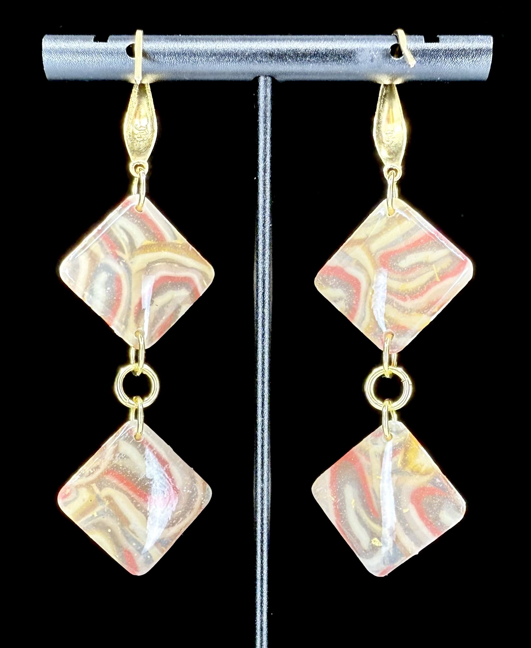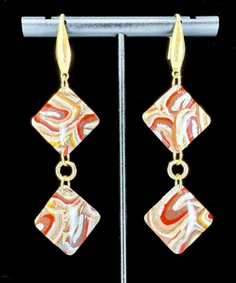 From the Caramel Apple Swirl Collection, these diamond earrings reflect the rich tones of caramel, cinnamon, and ember-red layered with ivory and gold. Each swirling pattern is created through rolling and blending custom polymer clay colors, then sealing both sides in high-gloss resin for luminous shine and lasting strength.