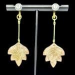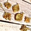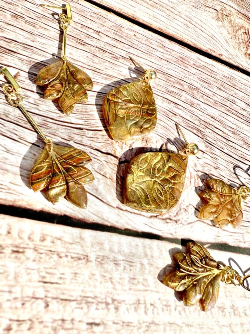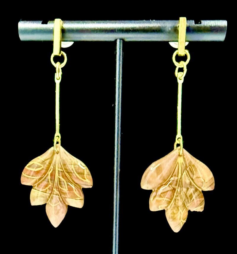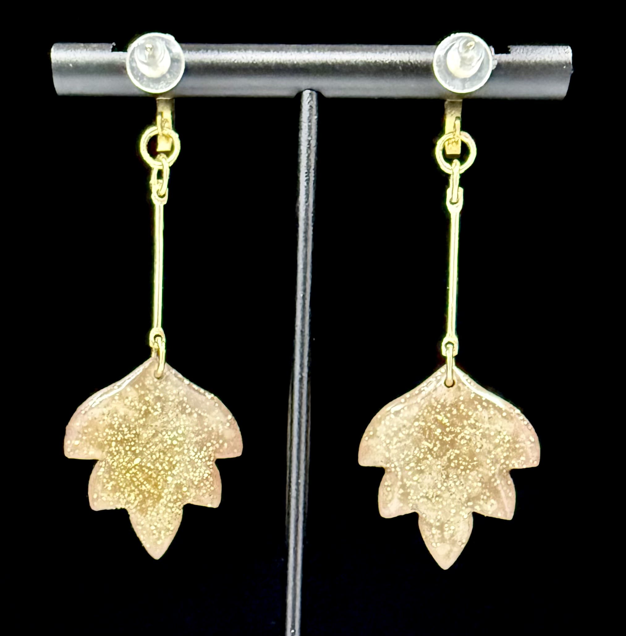 Golden leaf impressions with soft mica shimmer — these lightweight drops from the Carpet Bagger Collection balance vintage warmth with modern polish. See them in the natural sunlight here: https://www.facebook.com/share/r/17KjsSudPM/