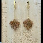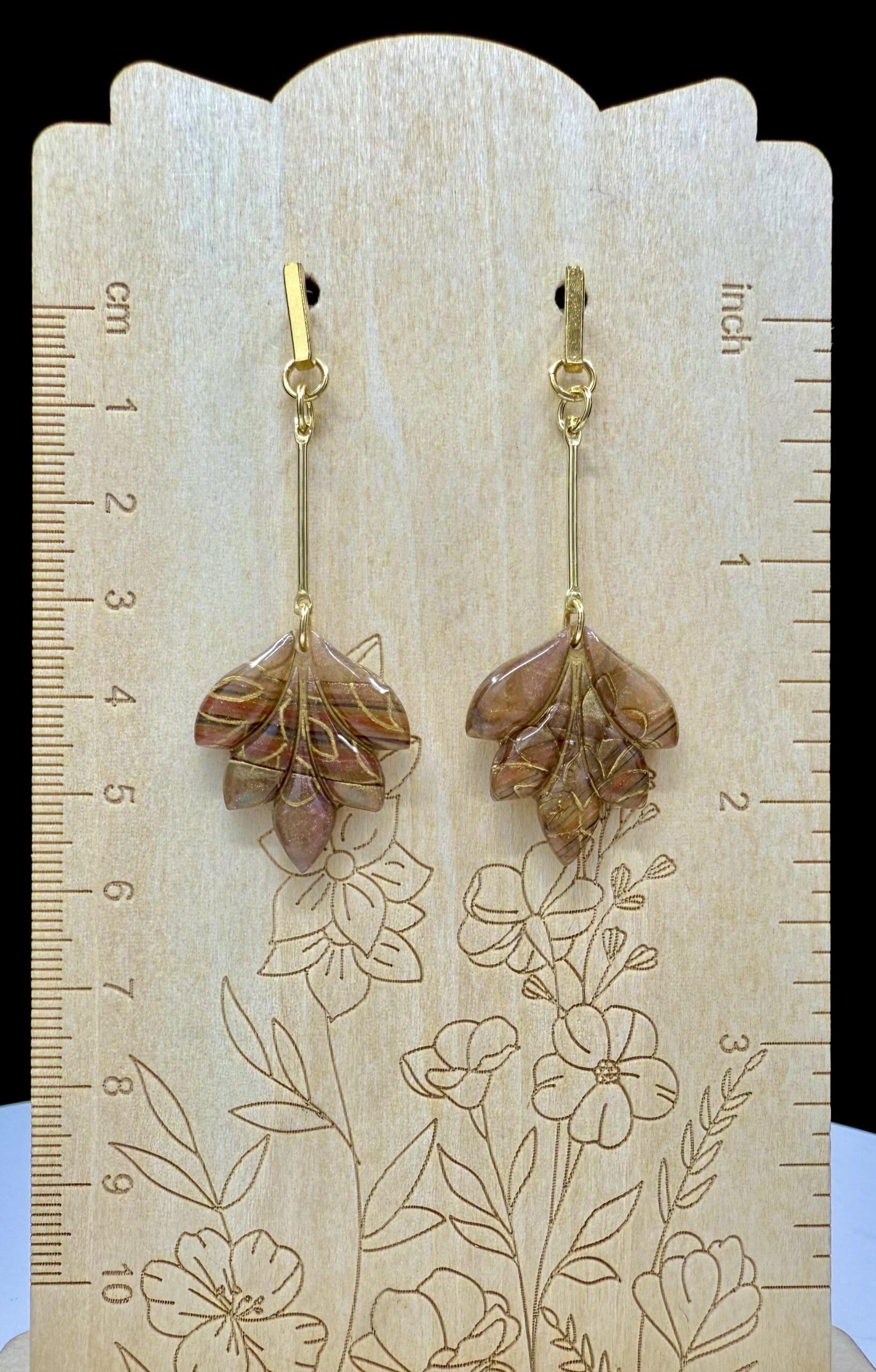 From the Carpet Bagger Collection, these long-drop leaf-form earrings capture the warmth of vintage autumn tones with subtle golden shimmer. Sculpted directly in polymer clay, each layered leaf impression reveals soft mica movement and gold detailing sealed beneath a smooth resin coat. The light shifts through each surface, showing gentle copper and bronze undertones that feel both timeless and contemporary.