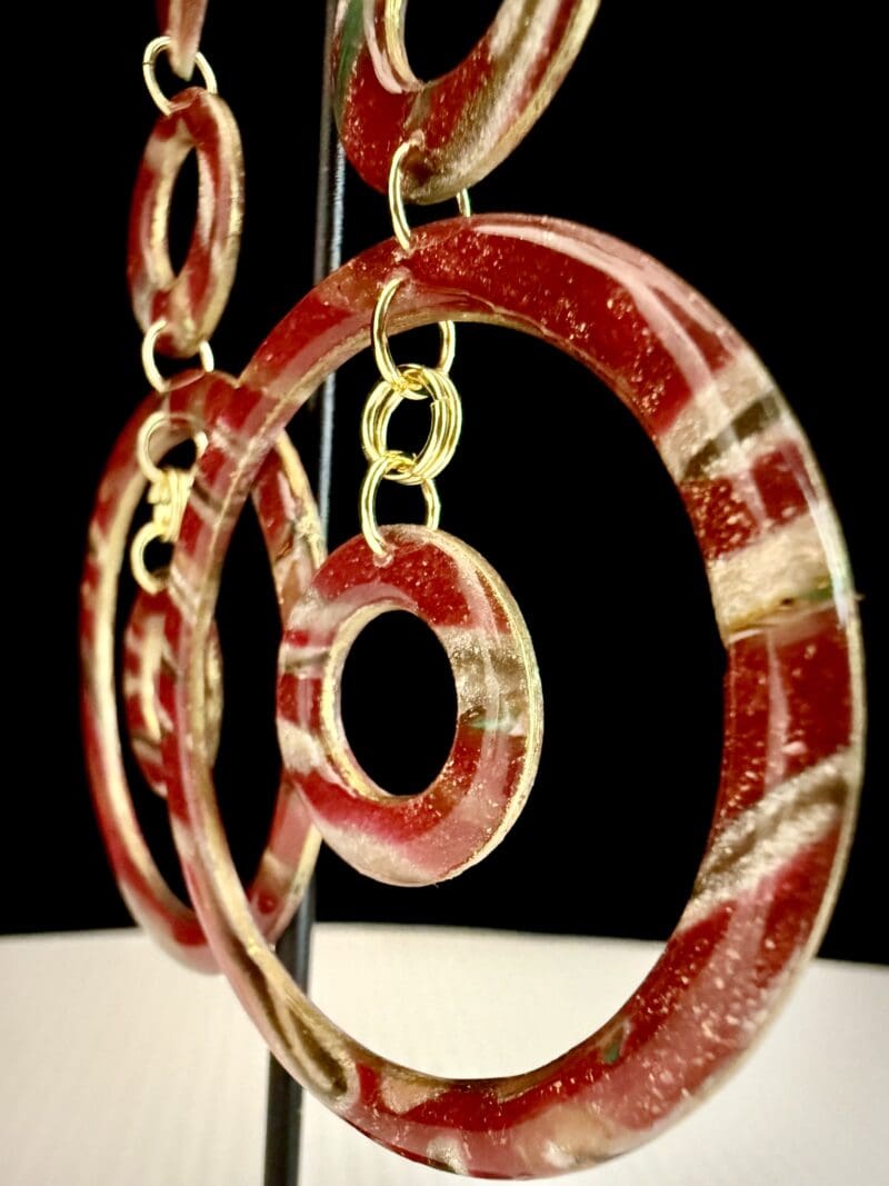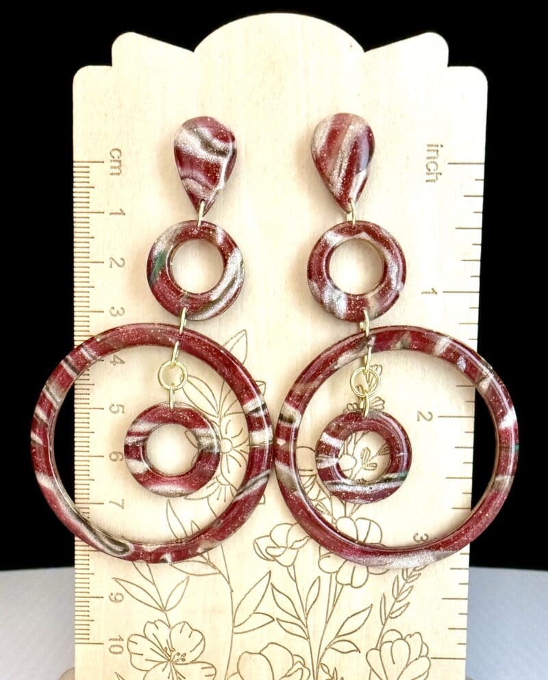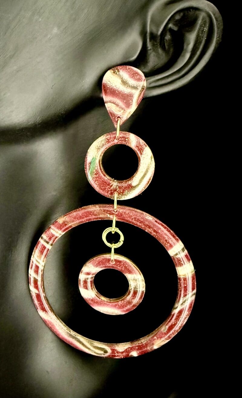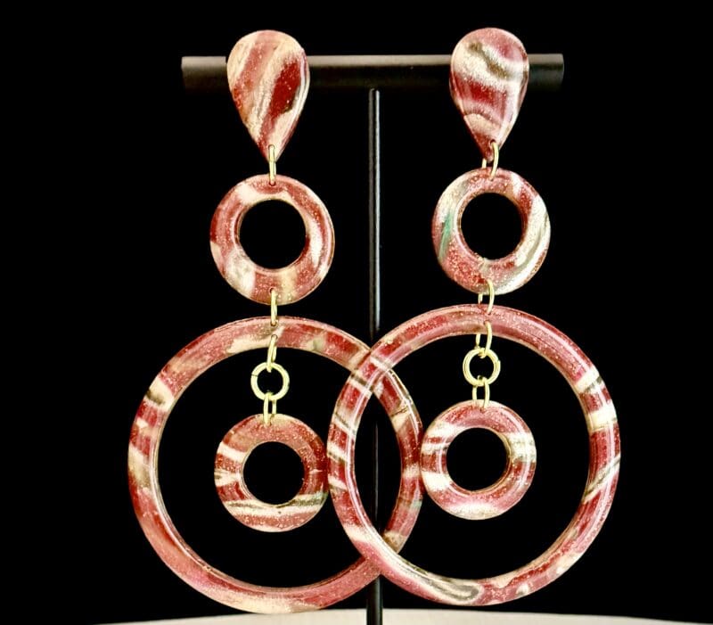 These earrings feature a stacked bell-inspired form with softly rounded geometry and marbled coloration throughout the clay. The surface patterning blends seasonal tones in an organic way, giving the design warmth and movement without novelty styling. Balanced scale and lightweight construction keep the look refined and wearable.