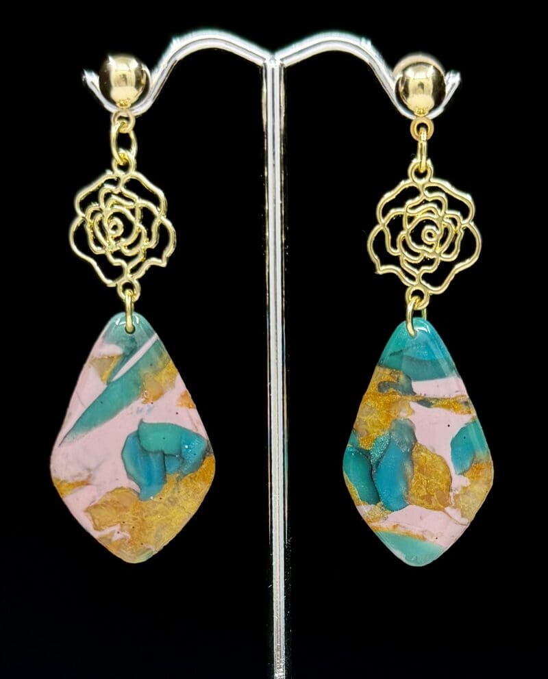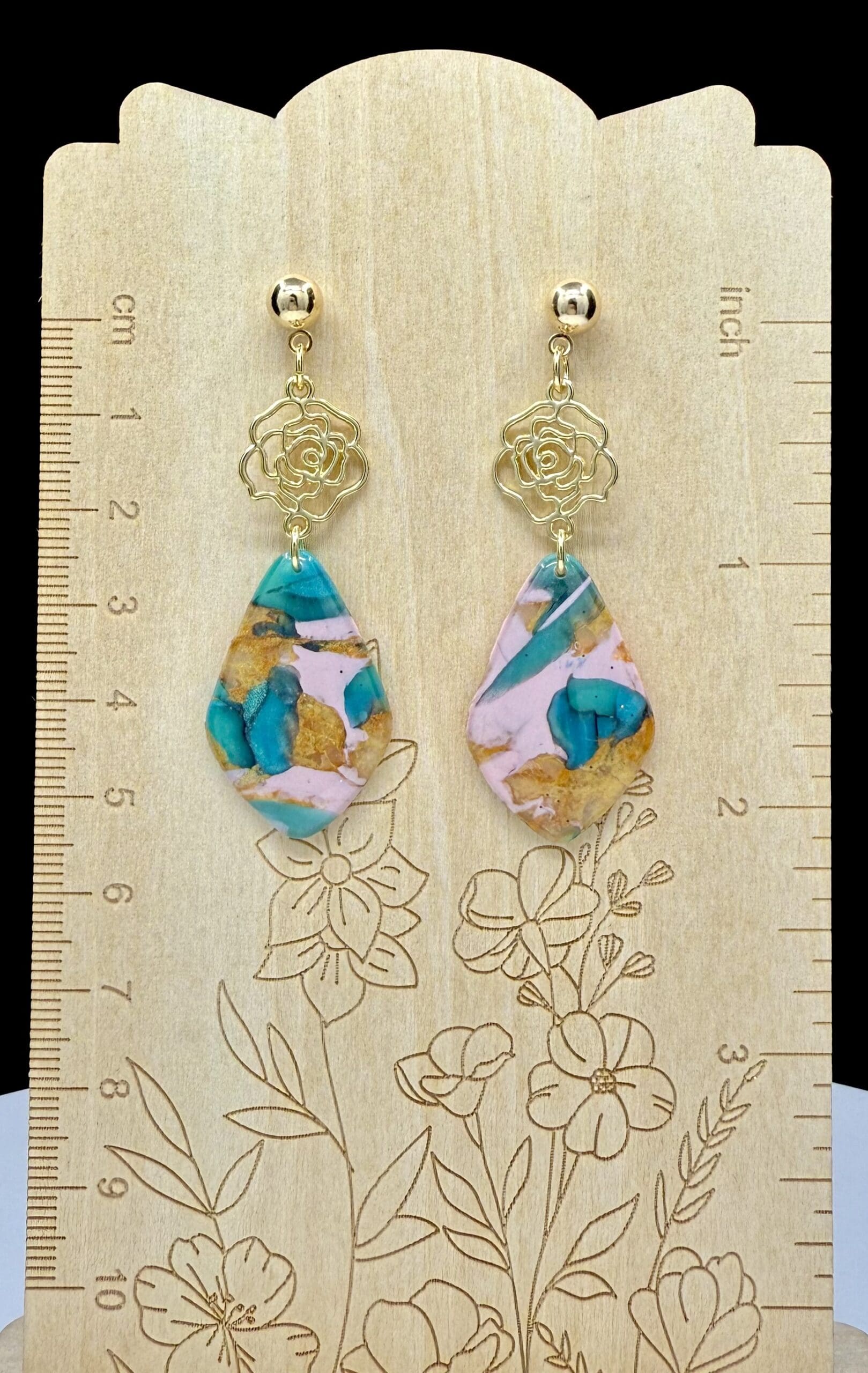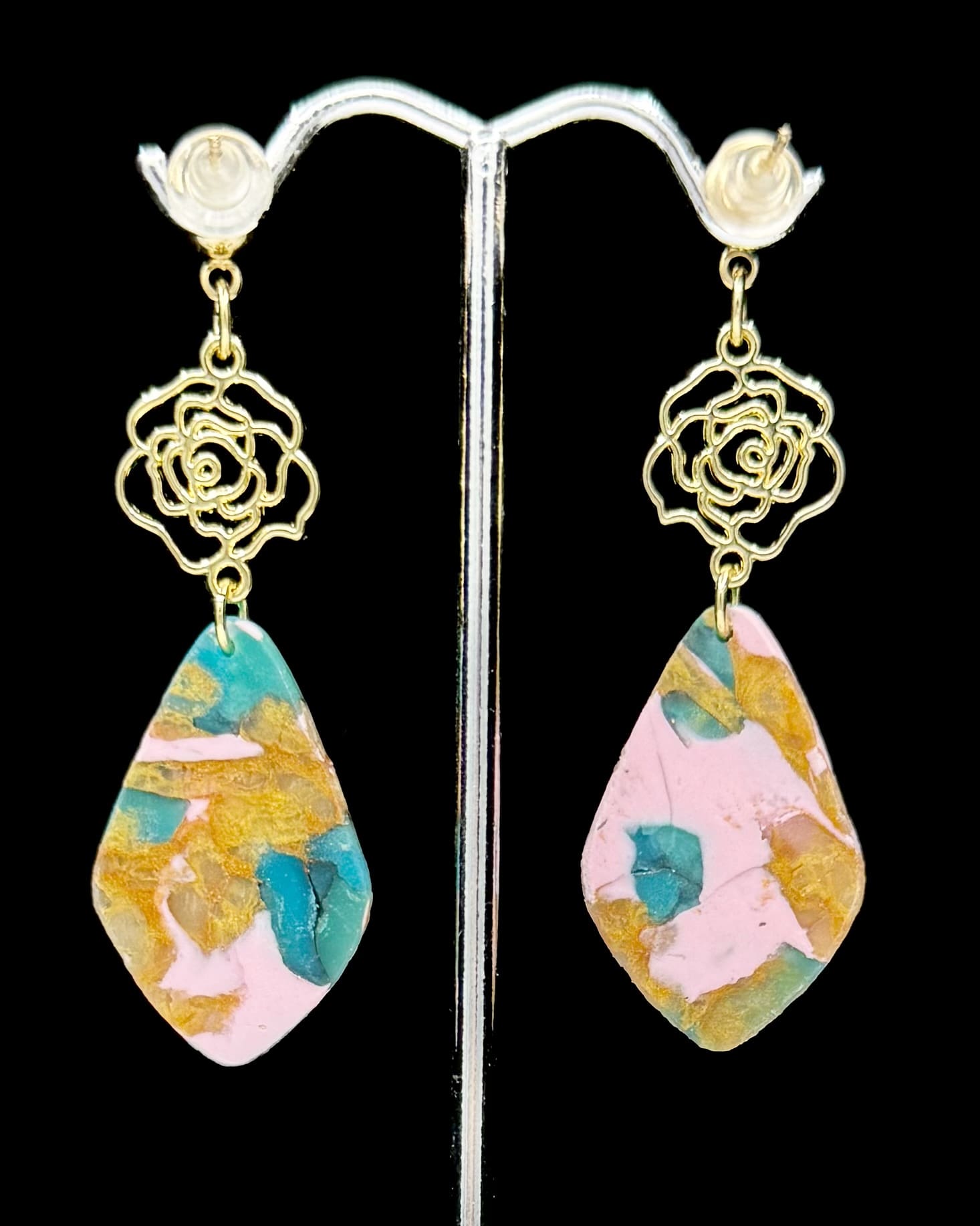 From the Cotton Candy Turquoise Collection, these rose-drop earrings blend turquoise, blue green, soft pink with golden accents into a striking terrazzo-style pattern. Each polymer clay piece is hand-mixed, creating swirls and layers of color that feel both playful and sophisticated. The drop is anchored by a gold-plated filigree rose that adds a touch of elegance, while the glossy resin sheen enhances depth and brilliance.