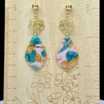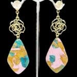 From the Cotton Candy Turquoise Collection these playful terrazzo-style drops with rose filigree accents, blending turquoise, blue green, soft pink with golden accents for a confident yet lightweight statement. Watch them being made here: https://www.facebook.com/share/v/14LottLAcvv/