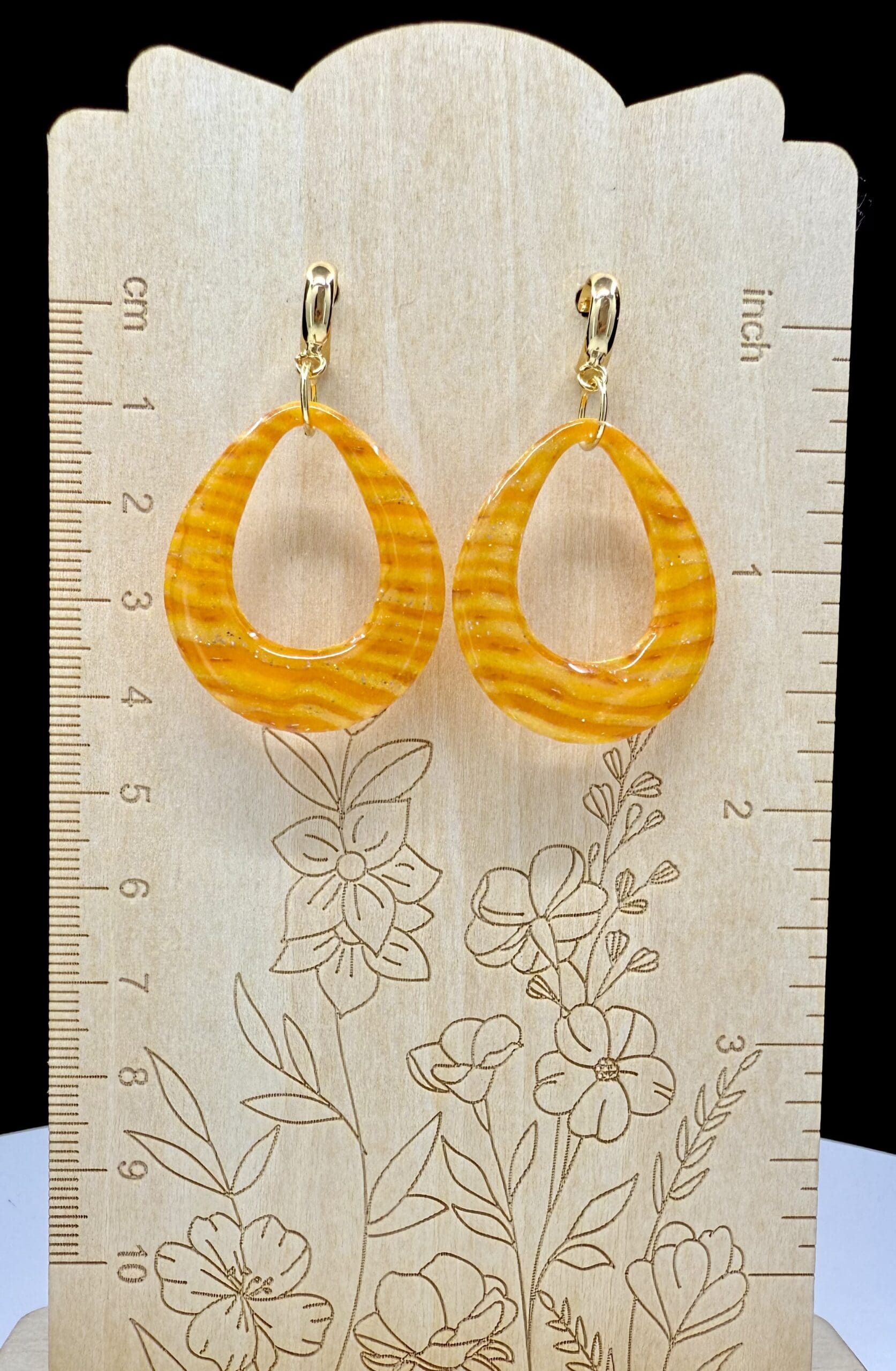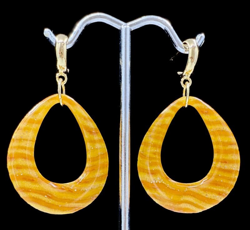 From the Deconstructed Candy Corn Collection, these open teardrop earrings showcase warm golden-orange tones with subtle shimmer and wave-like texture. The glossy resin finish highlights their luminous surface, giving them a radiant glow that catches the light with every movement.