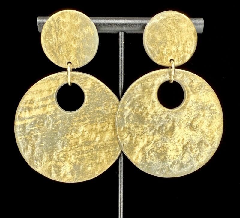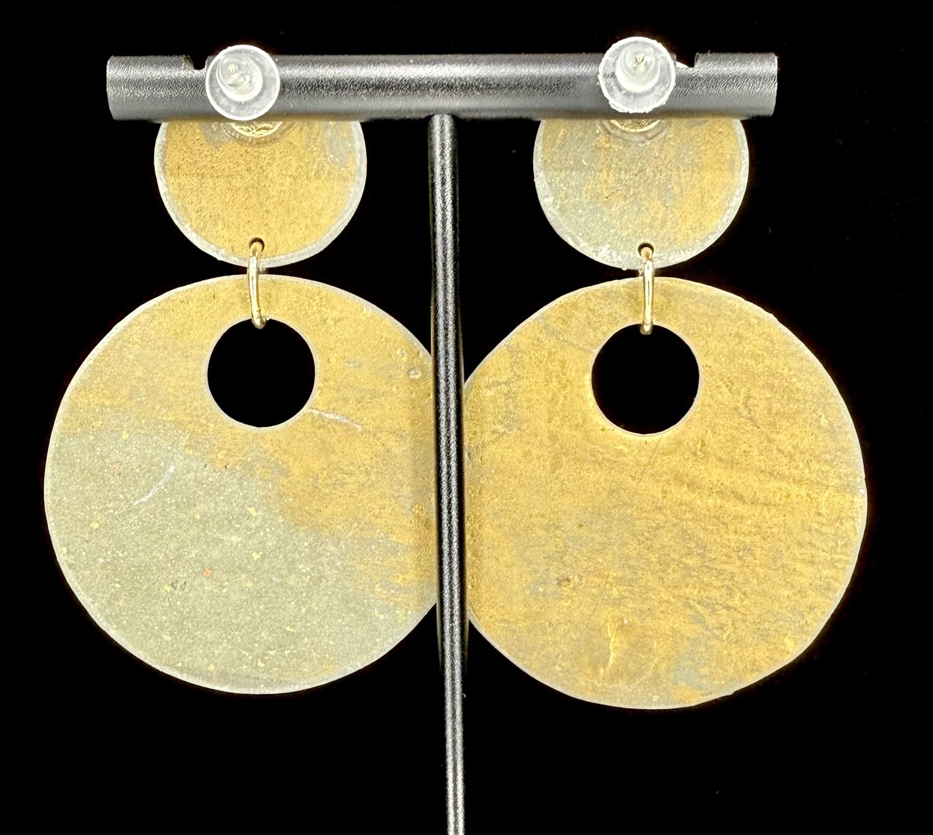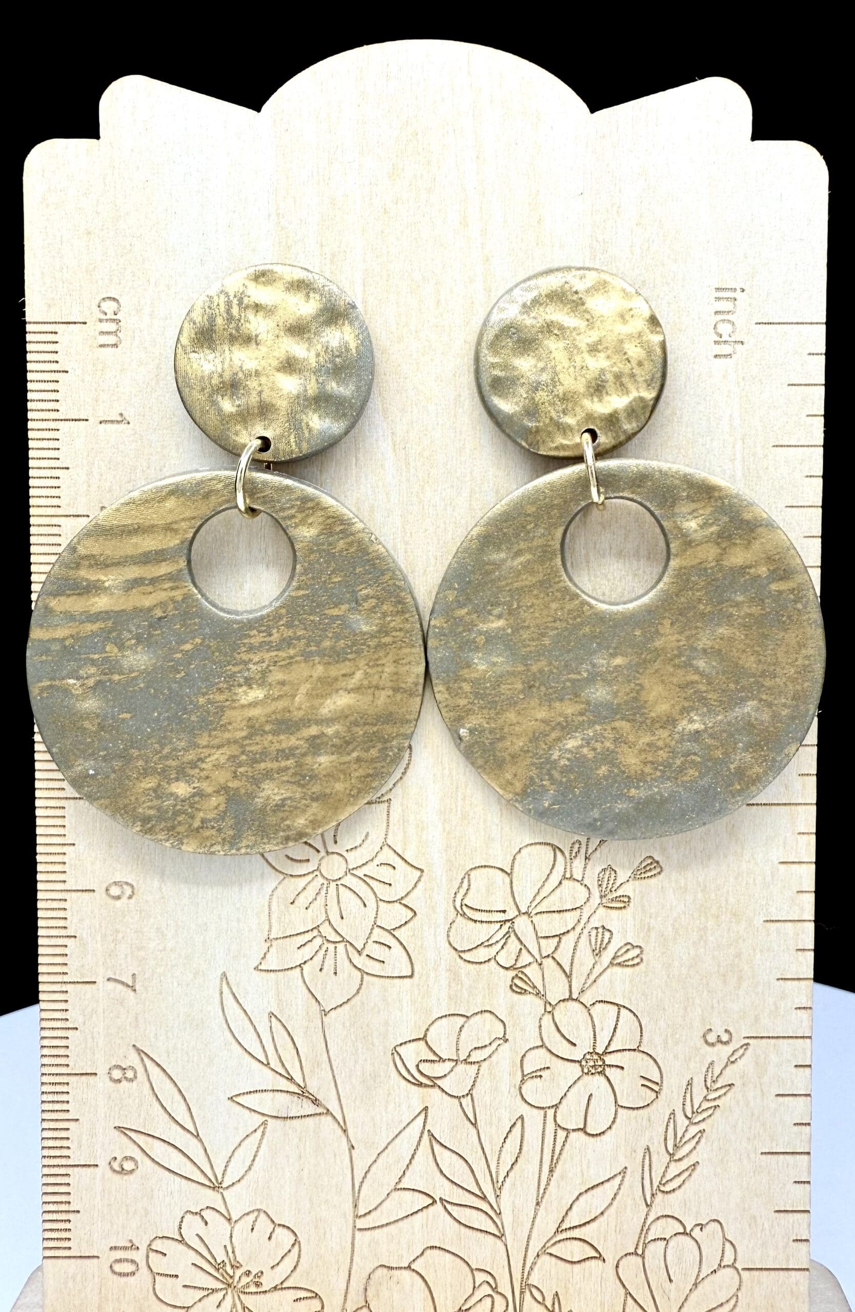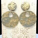 Dented Metal polymer clay dual circle drop earrings with hammered texture and fine sheen gloss. Lightweight, handcrafted, hypoallergenic, and shipping included.