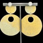 From the Dented Metal Collection, these dual circle drop earrings echo the look of forged metal softened by artistic imperfection. The surface texture mimics the organic depth of hammered brass, enhanced with a fine sheen gloss that adds subtle reflection without losing its raw metallic edge.