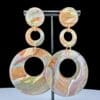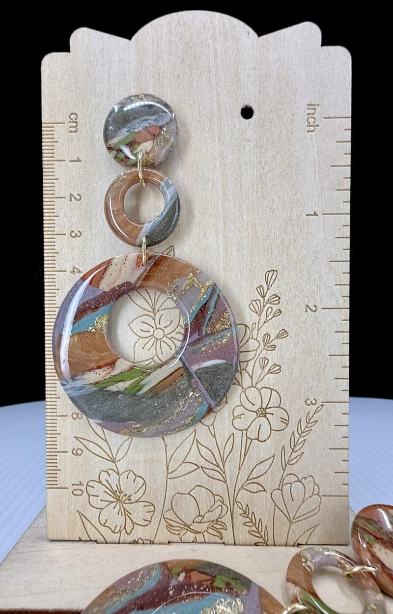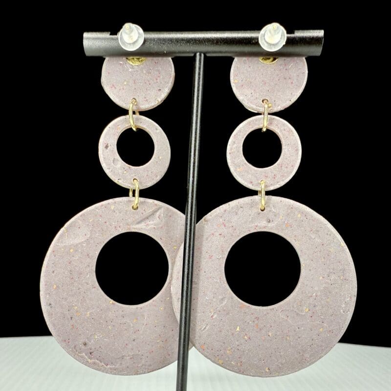 These statement earrings feature a stacked circular construction with open rings that highlight flowing marbled stone patterning throughout the clay. Earthy tones, mineral-like striations, and metallic flecks create a geode-inspired surface that feels organic and layered without visual heaviness. Designed for movement and impact while remaining balanced in wear.