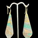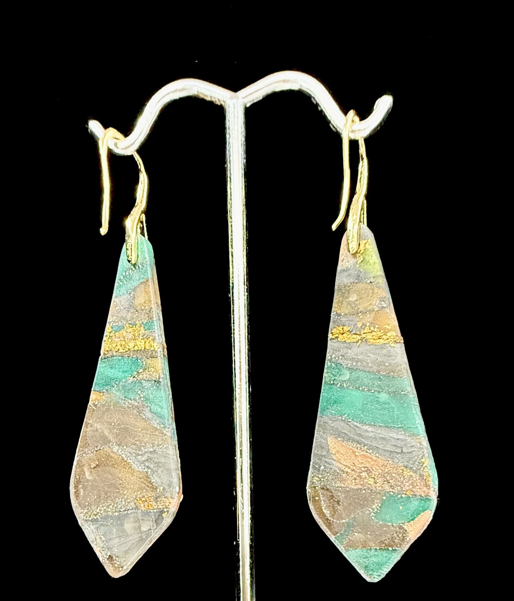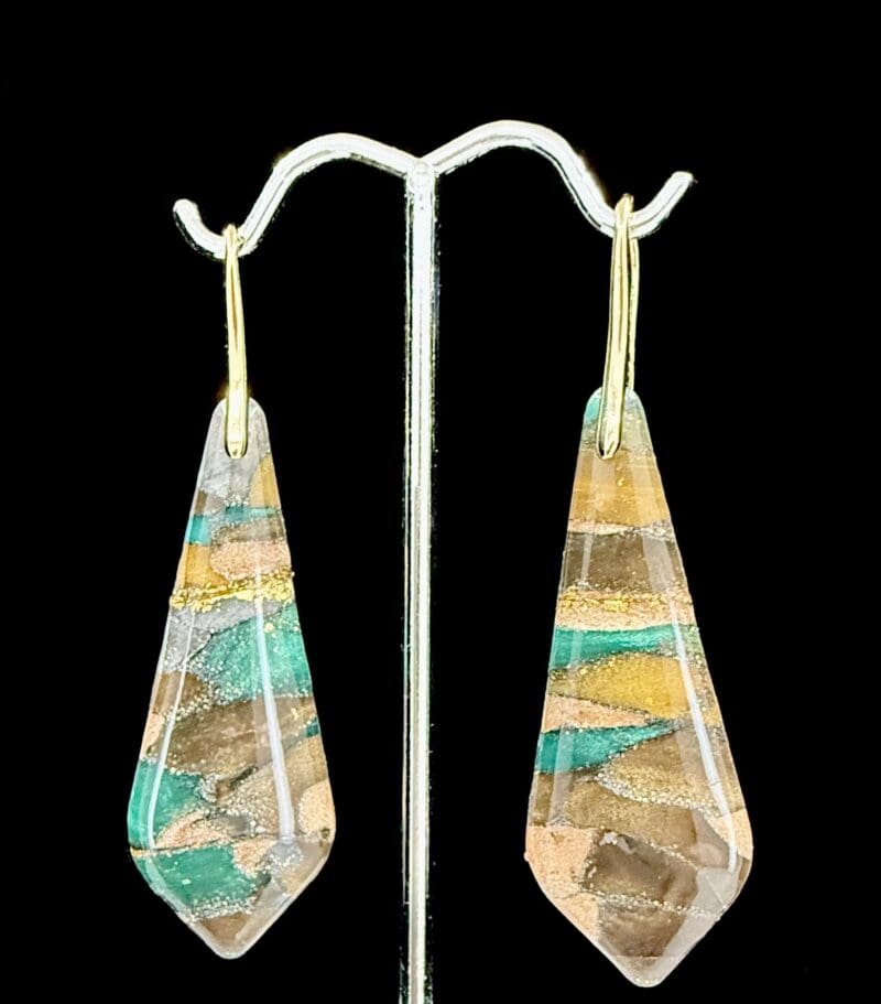 One-of-a-kind Earthstone Trapezoid Dangle Earrings handcrafted from polymer clay in earthy green, gold, and bronze tones. Lightweight, resin-finished, and bold.