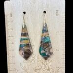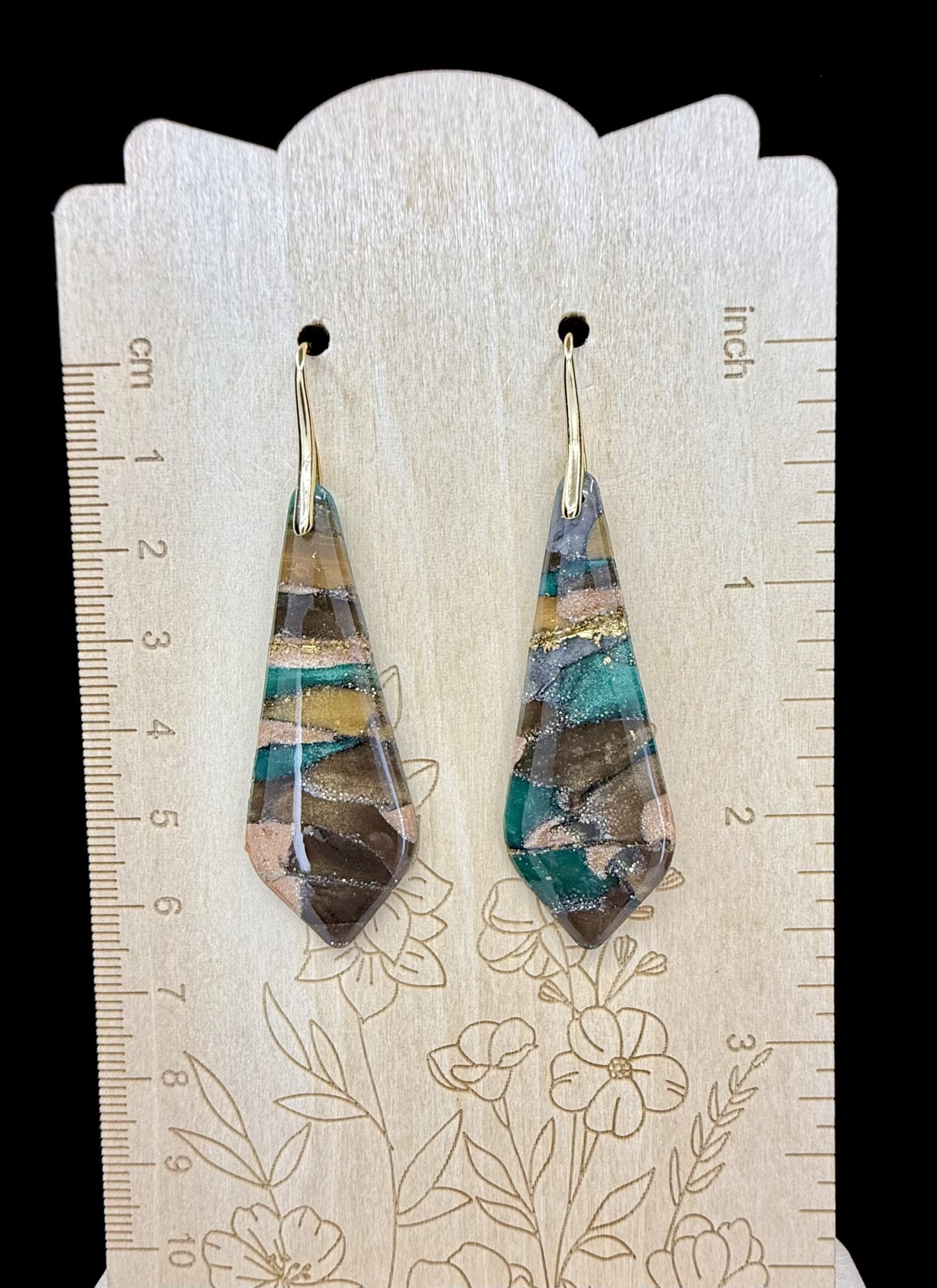 The Earthstone Trapezoid Dangle Earrings combine bold geometry with natural-inspired shimmer. Hand-mixed polymer clay in layers of green, bronze, gold, and copper tones create a marbled effect reminiscent of polished stone. Each piece is sculpted into a sleek trapezoid shape and finished with a high-gloss resin coating that enhances the depth and brilliance of the colors.