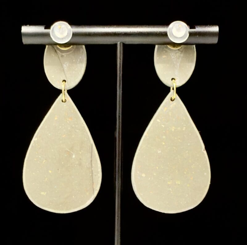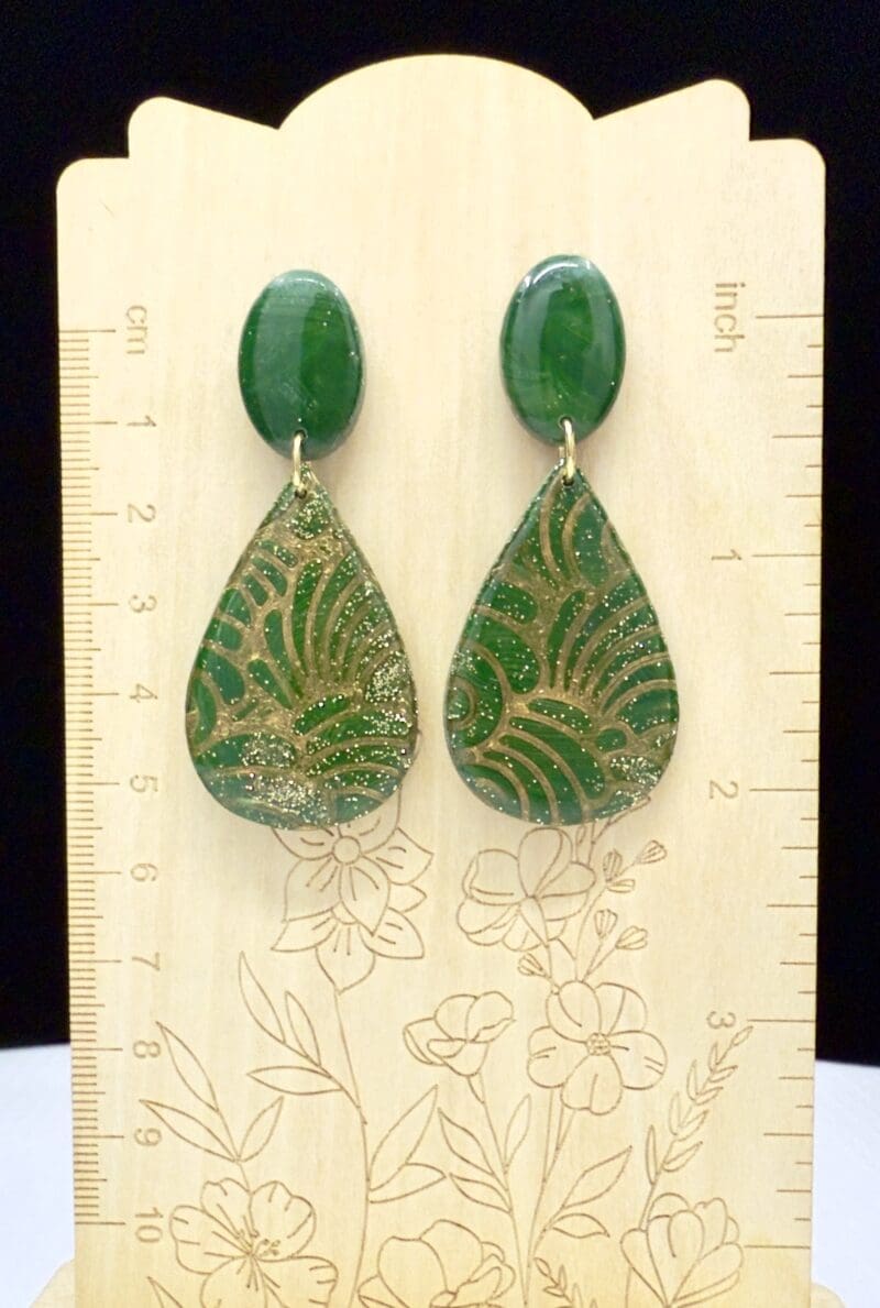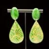These statement earrings feature an oval post paired with a compact teardrop drop in hand painted emerald green with golden embellishments. The detailed surface work and high-gloss finish create a refined look with controlled movement and a lighter visual footprint than larger statement styles.