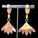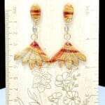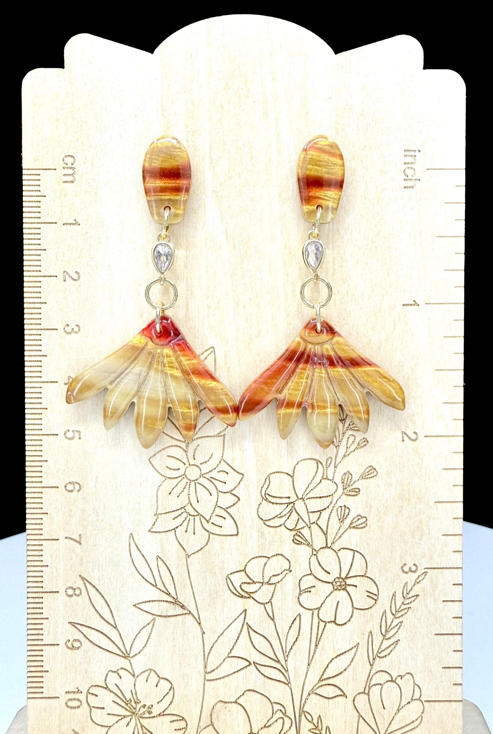 Fan-shaped earrings with marbled undertones and fiery highlights, resin-sealed for brilliance. Lightweight statement pair with gold posts and crystal connectors. Watch these being made here: https://www.facebook.com/share/v/1UVbKdg2u6/