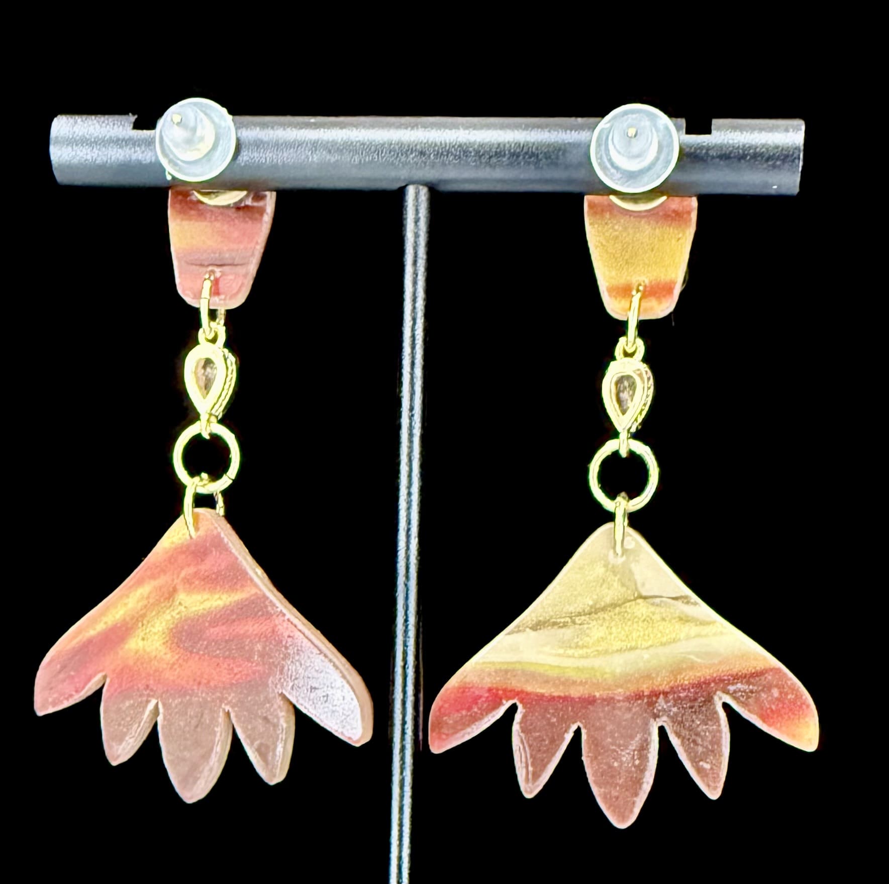 From the Eternal Burning Embers Collection, these sculpted fan earrings glow with layered warmth—soft earthy undertones ignited by vivid streaks of gold and ember. The marbled blends create the illusion of molten movement, sealed under resin for a lasting glass-like finish.