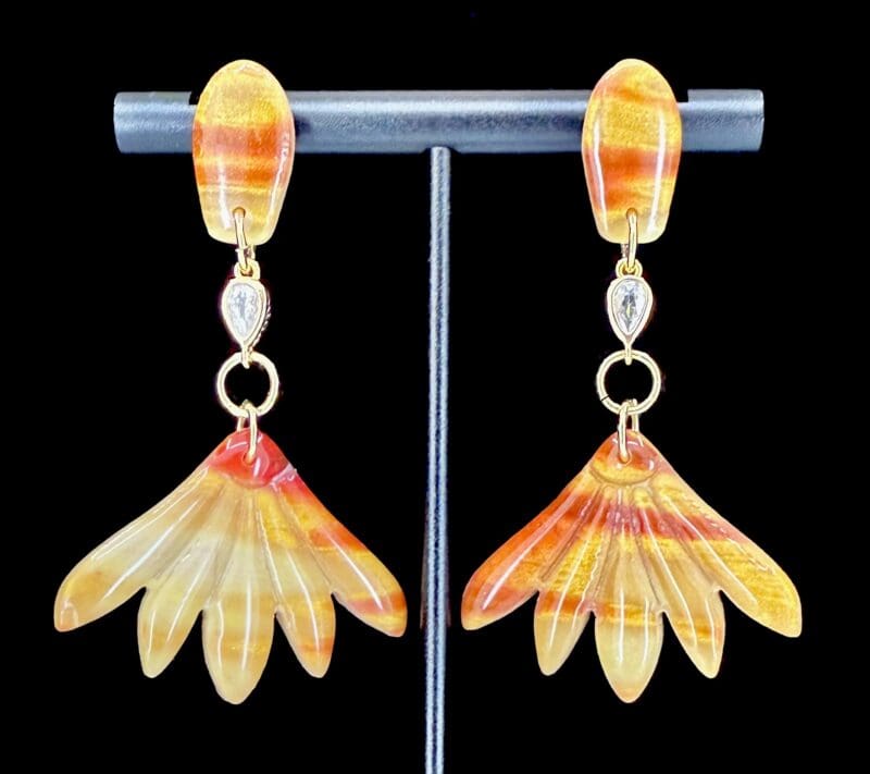 The airy fan silhouette adds natural flow, bold enough for statement wear while still light enough for everyday comfort. At just 2.49 g per earring, they balance artistry, strength, and firelit brilliance in a design that catches the eye from every angle.