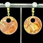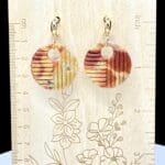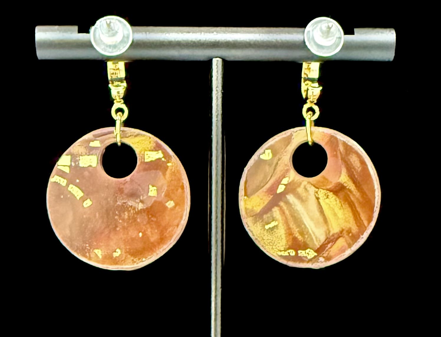 Circle Dangle Earrings with ember marbling and selective resin finish. Lightweight, textured design with gold-plated huggie hoop findings. Watch these being made here: https://www.facebook.com/share/v/17HrqwHWb2/