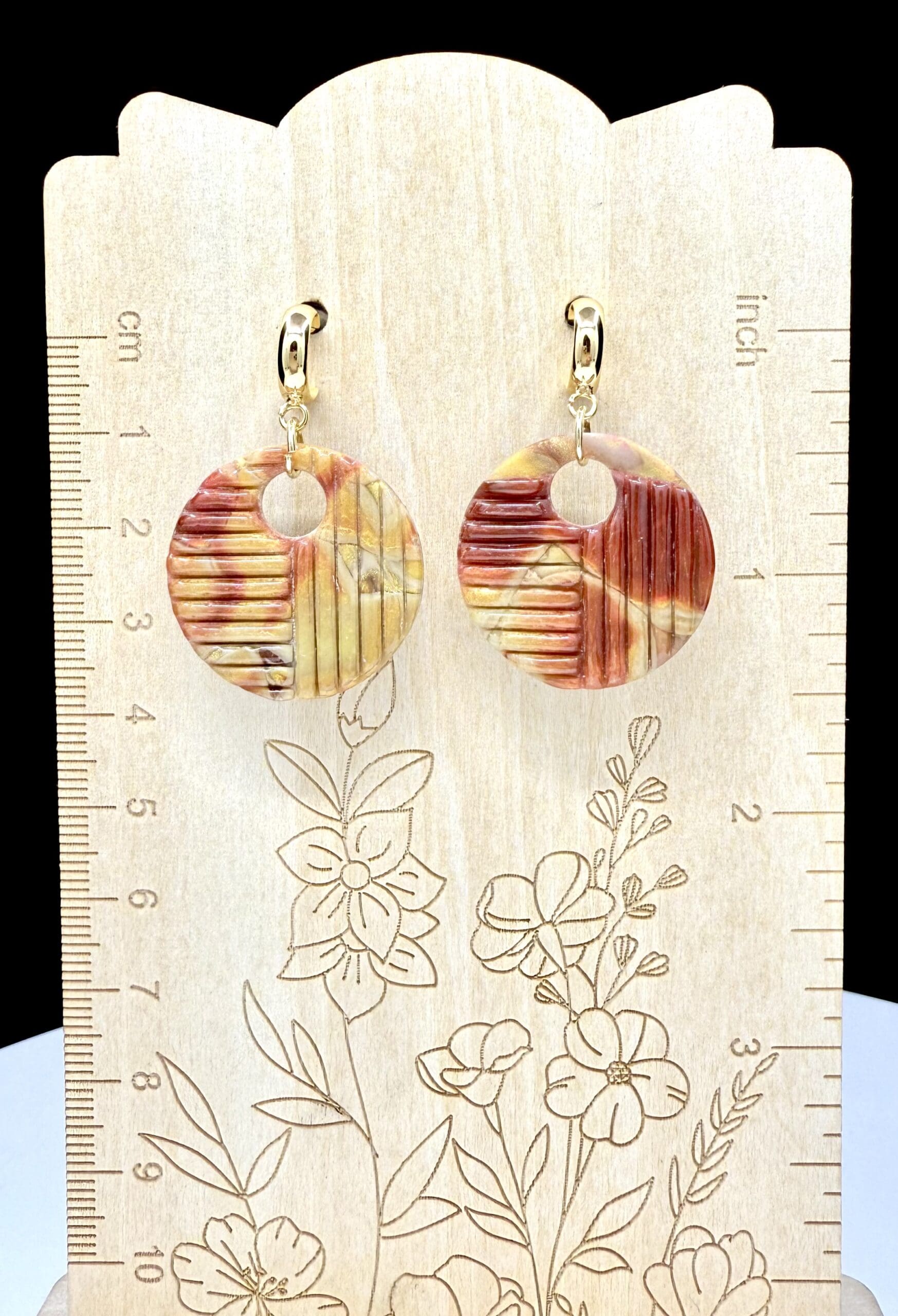 From the Eternal Burning Embers Collection, these textured Circle Dangle Earrings radiate fiery depth with a balance of structure and flow. The marbled clay layers reveal glowing ember tones against earthy undertones, while resin is carefully applied only to the raised textures. This selective finish enhances durability and creates a striking contrast between matte and gloss, giving each piece dynamic character.