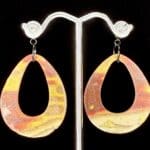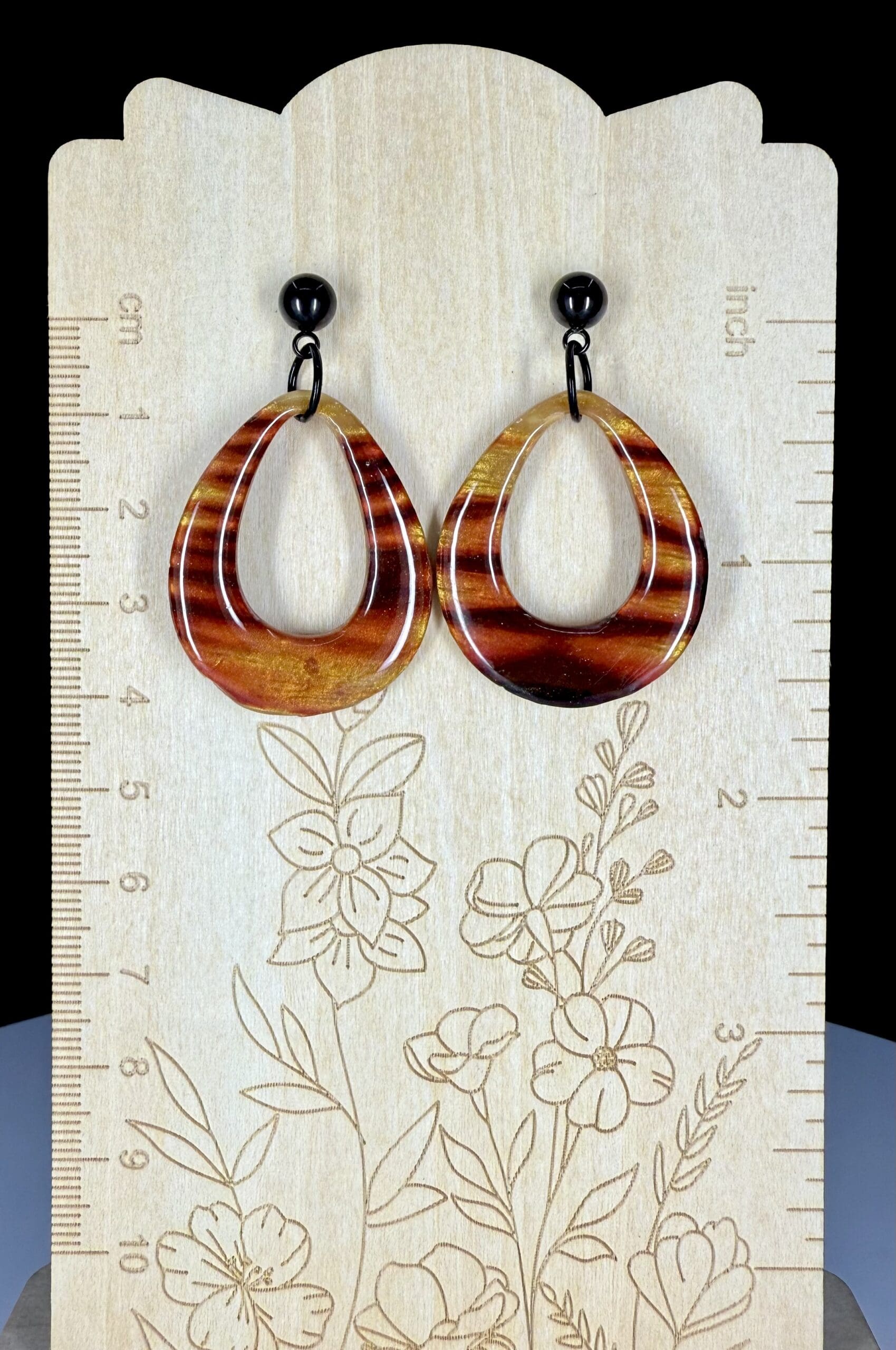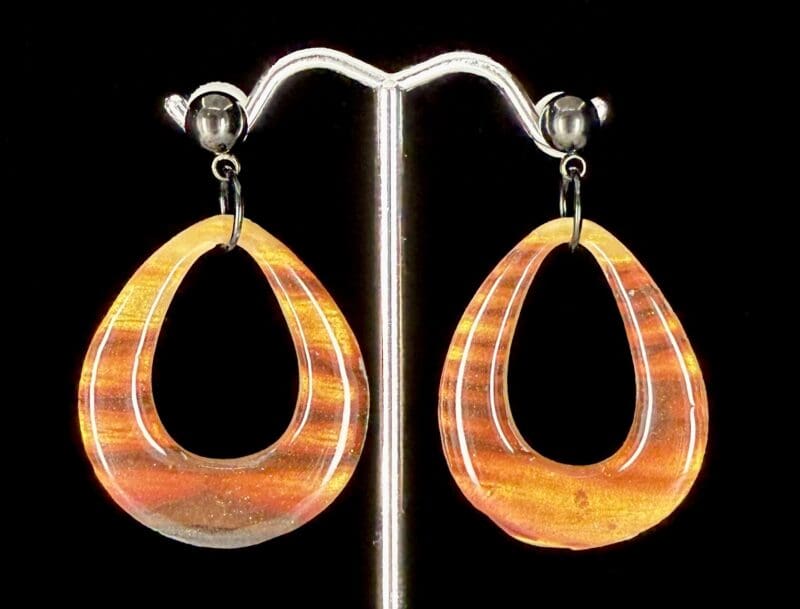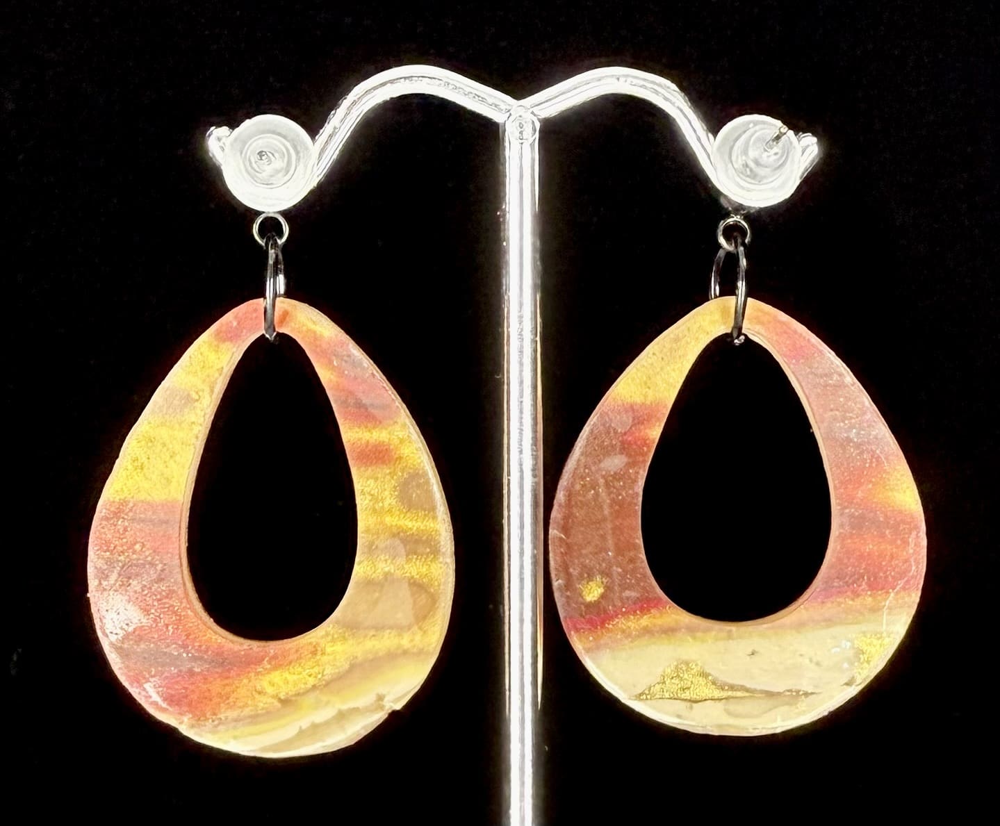 Teardrop Hoop Earrings with ember-toned marbling, sealed in resin for shine and durability. Lightweight statement pair with black ball-post studs. Slight imperfections reflected in price.k Watch these being made: https://www.facebook.com/share/v/1UVbKdg2u6/