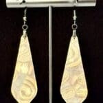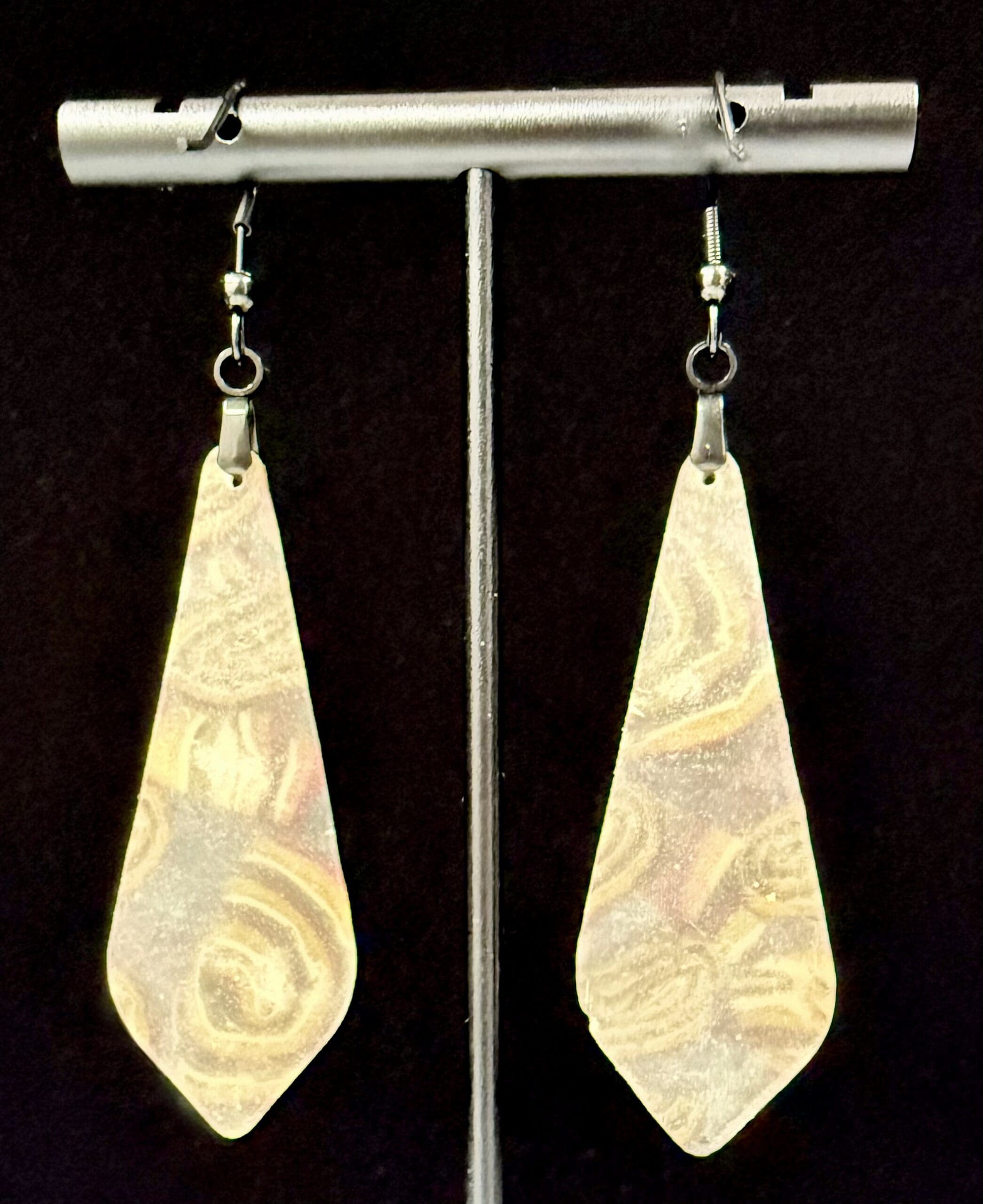 The elongated, tapered diamond-teardrop silhouette creates an elegant line while showcasing the swirling clay palette. At about 2.37 g per earring, they bring striking color without heaviness — perfect for day-to-night wear.
