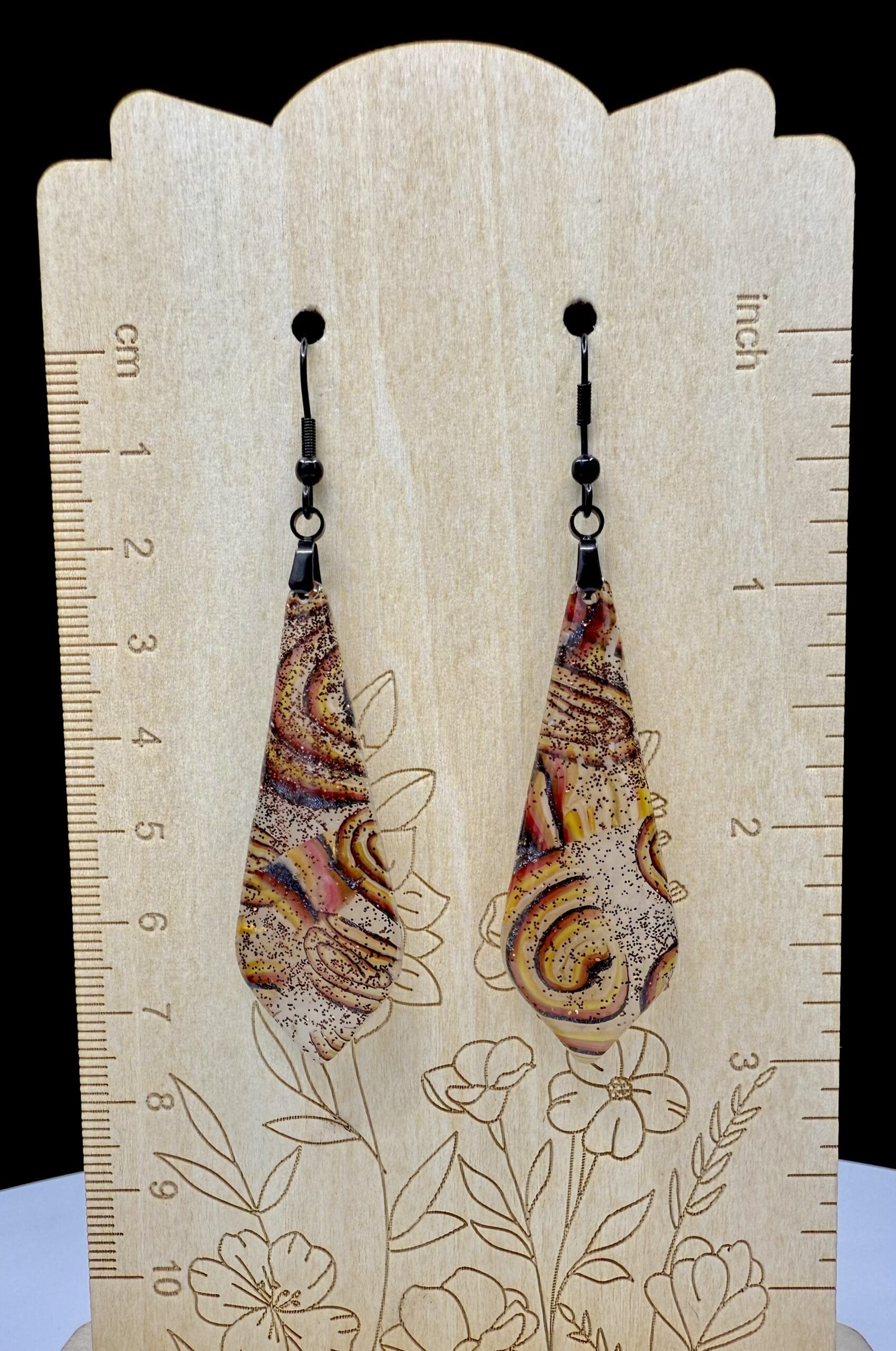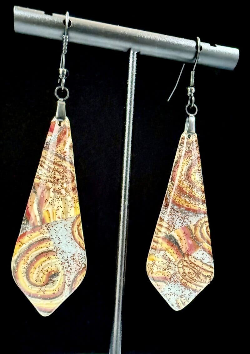 From the Eternal Burning Swirls Collection, these tapered diamond-teardrop earrings glow like molten glass. Hand-mixed polymer clay in deep amber, bronze, cinnamon, and ember-red tones is layered and rolled to create swirling ribbons of color. Each earring is sealed in resin on both sides for a durable, high-gloss finish that amplifies the shimmer and depth.