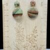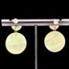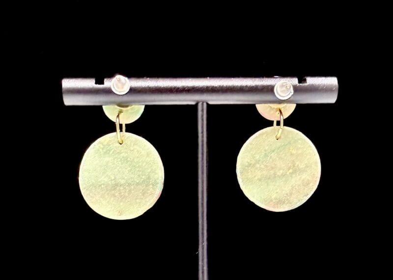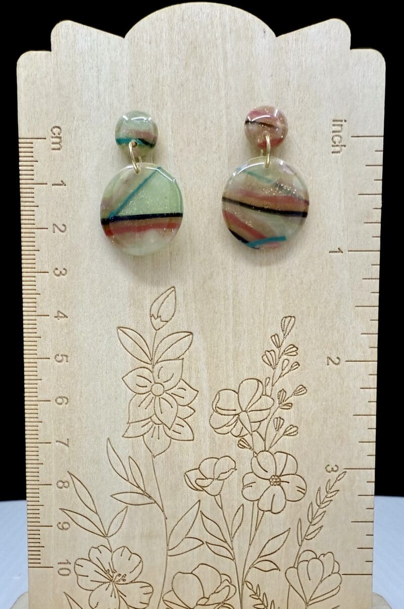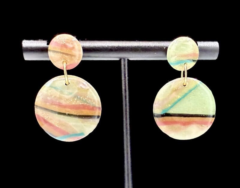 These earrings feature a compact stacked circular construction composed of a solid stud paired with a suspended solid disc below. Flowing linear striping moves across the surface of the clay, creating soft visual rhythm through color rather than form. Subtle shifts in tone and line placement make each pair quietly expressive while remaining minimal in scale.
