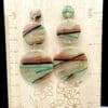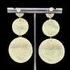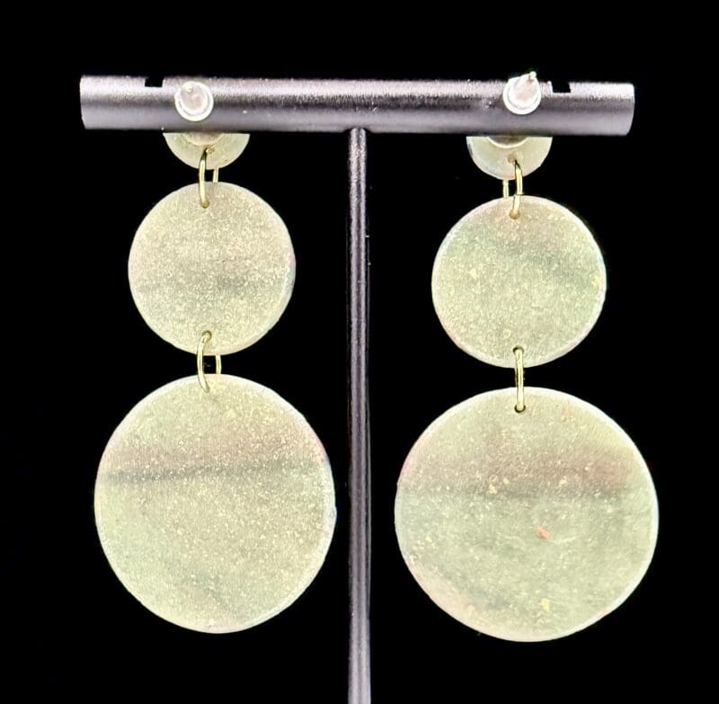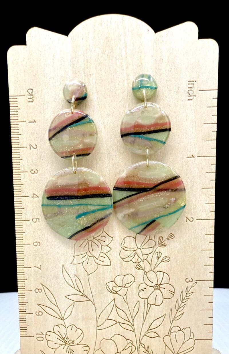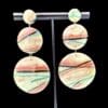 These earrings feature a stacked circular construction that showcases flowing linear striping across the surface of the clay. Soft, intersecting lines move through translucent layers, creating visual rhythm and depth within a compact, solid form. The design emphasizes surface movement and pattern rather than open space, keeping the look cohesive and refined.