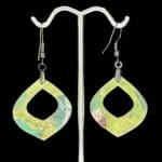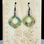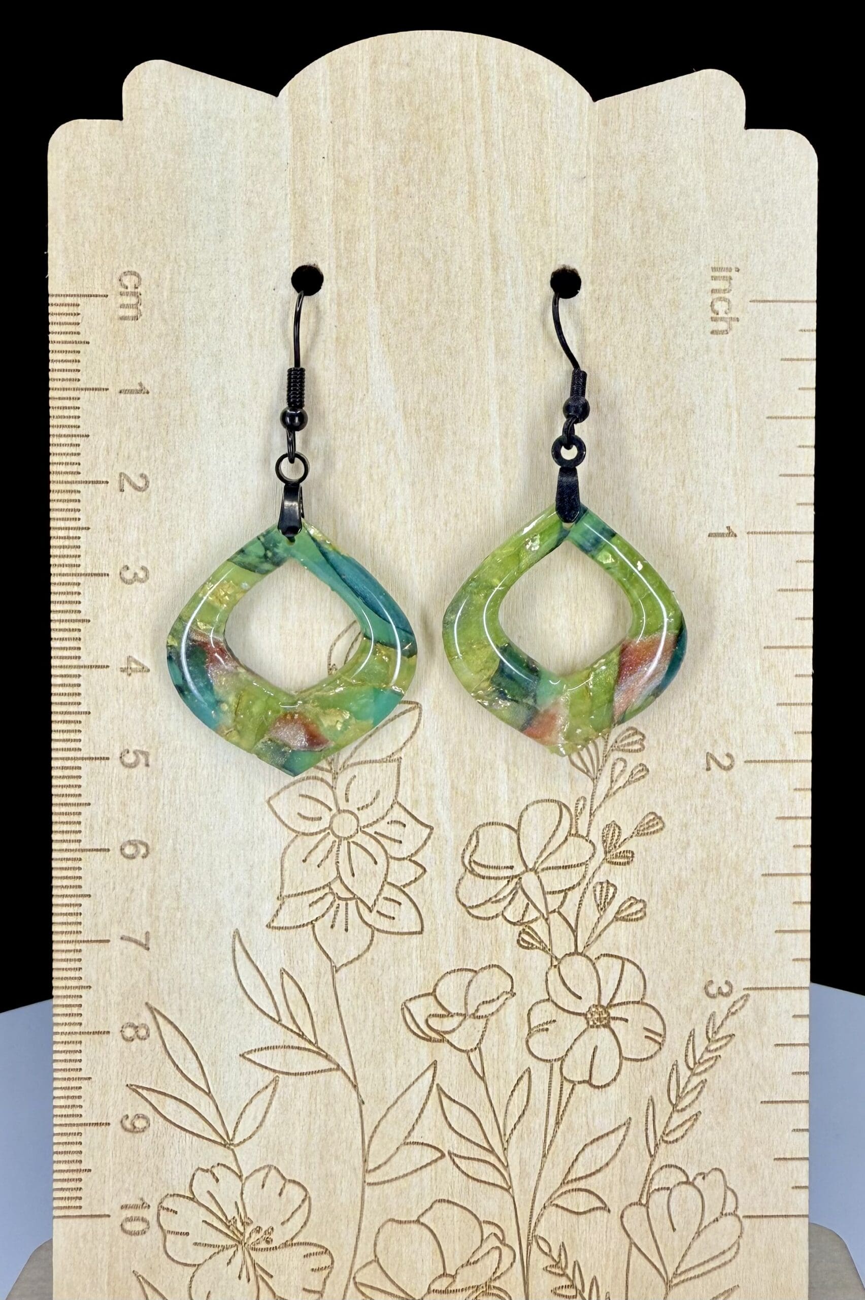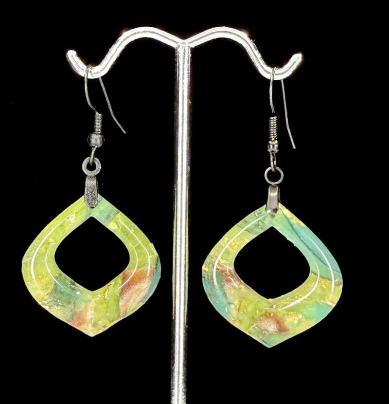 From the Foliage Collection—resined open marquise earrings in green, golden, and white blends with copper undertones. Lightweight, durable, and artfully bold.