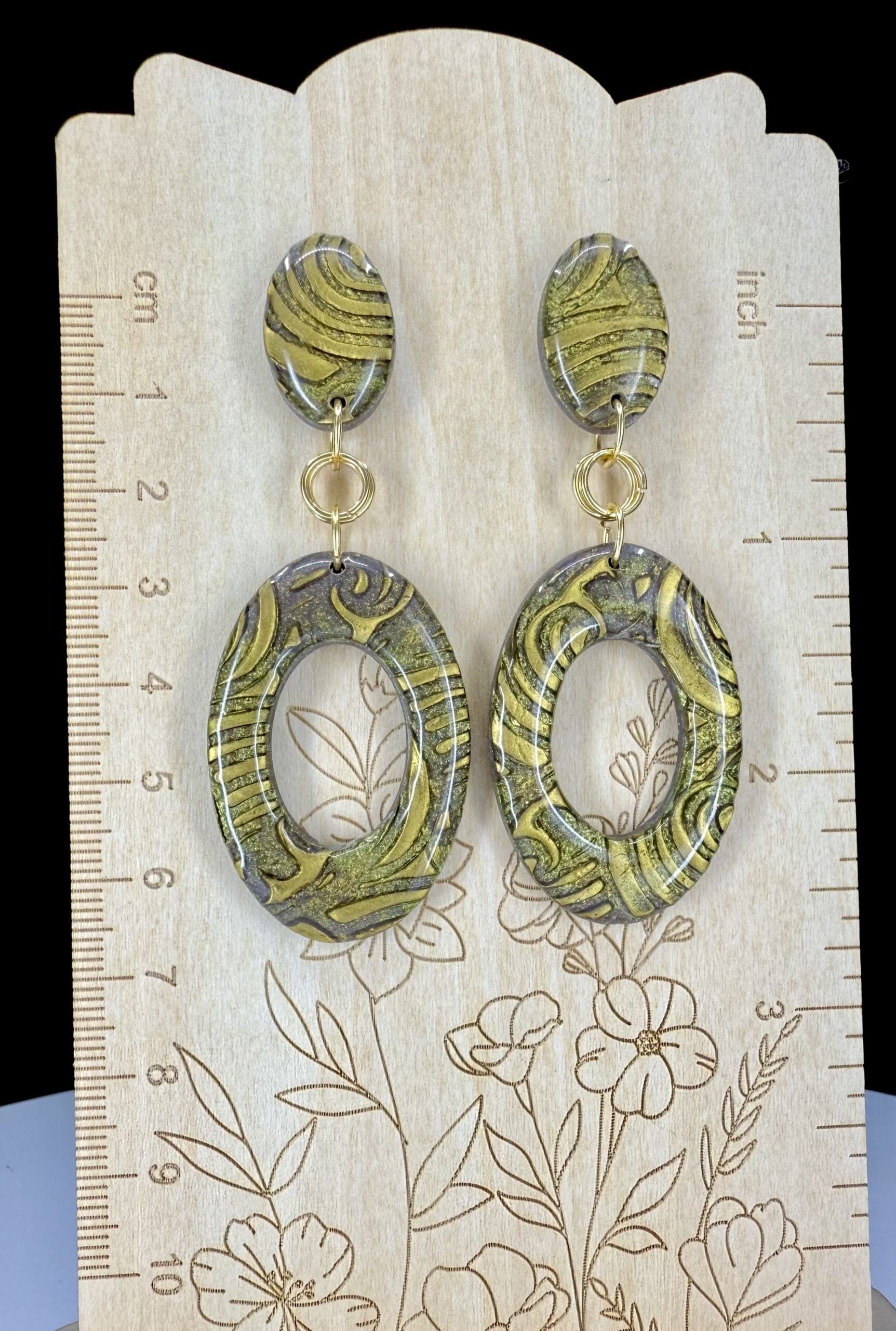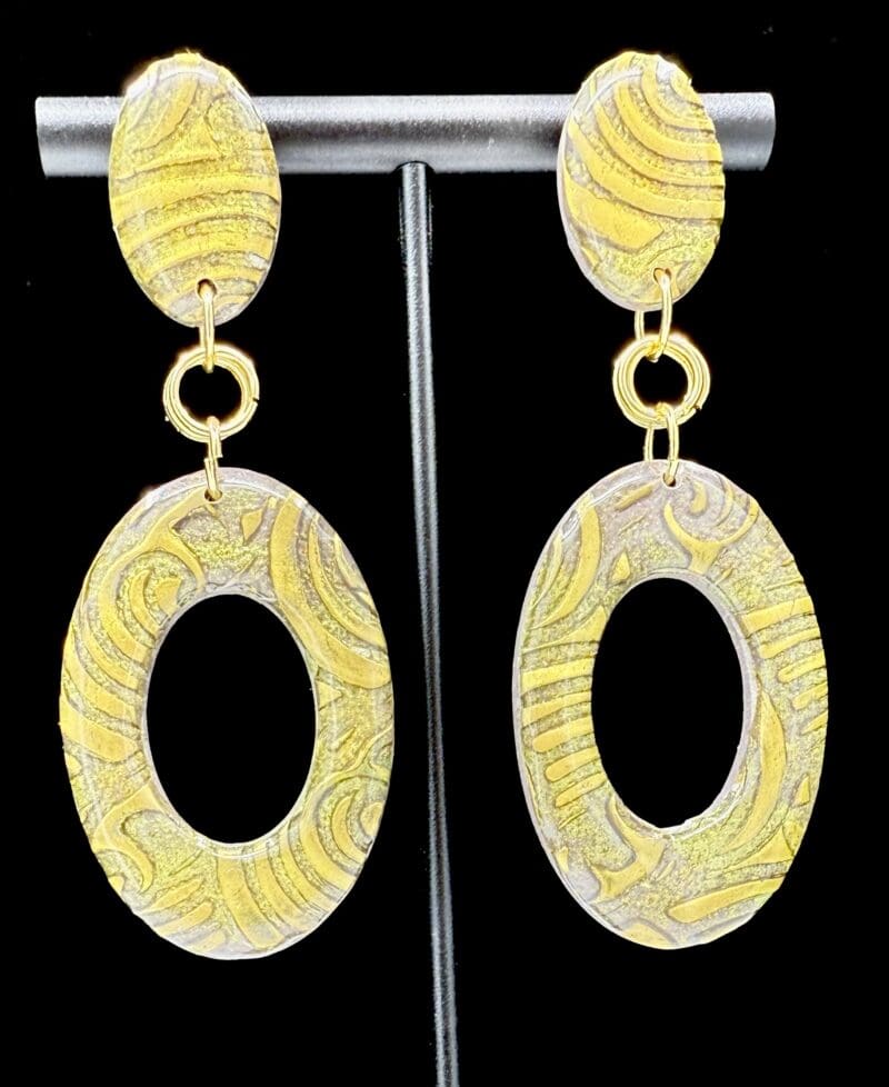 The Golden Brocade Collection reimagines the elegance of vintage brocade textiles in hand-mixed polymer clay. Each piece showcases the swirling, embossed patterns reminiscent of antique velvet and woven fabrics, where golden highlights shimmer against muted undertones. Through layered textures and a high-gloss resin finish, these earrings capture the richness of heritage design while remaining distinctly modern.