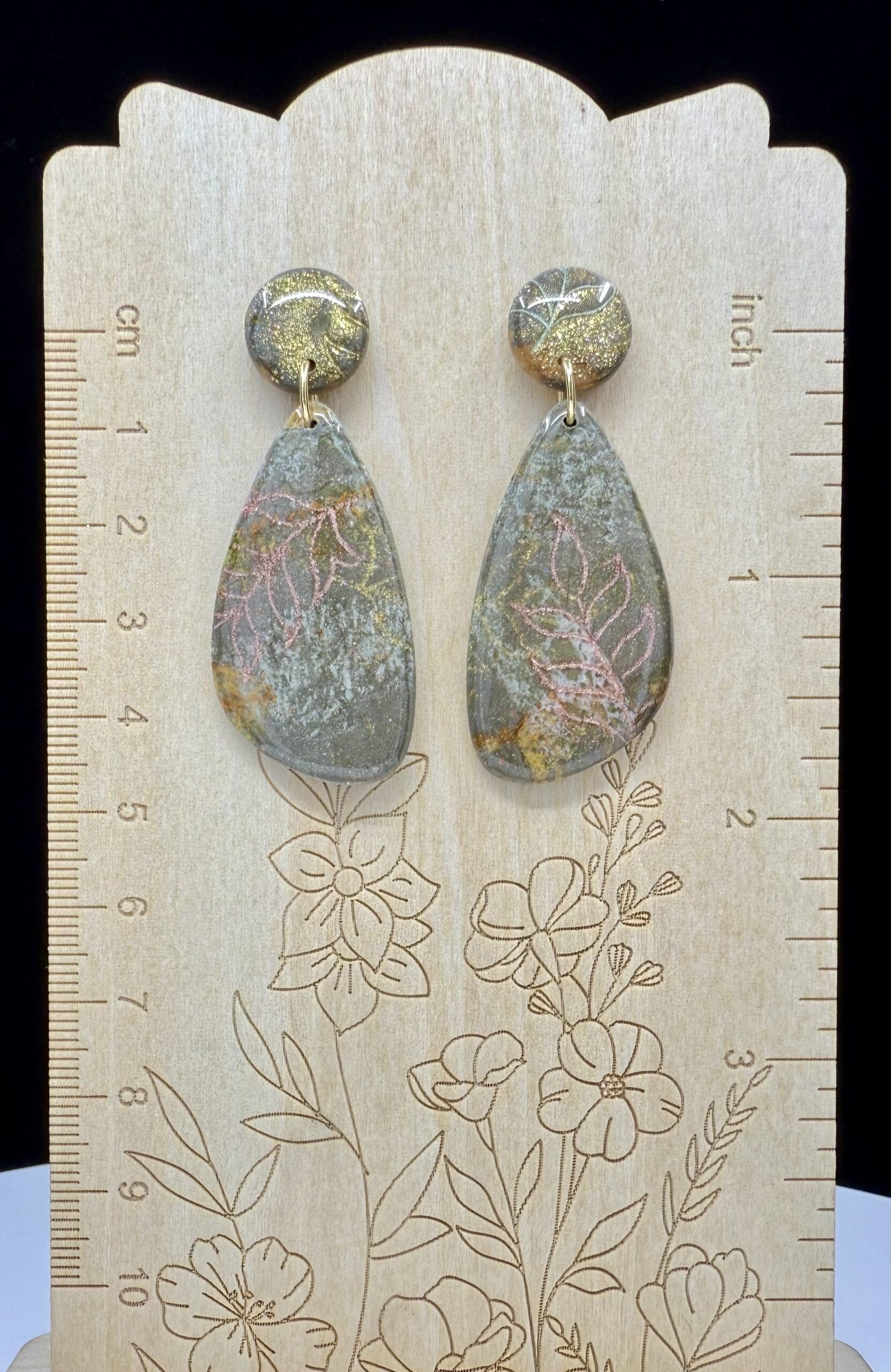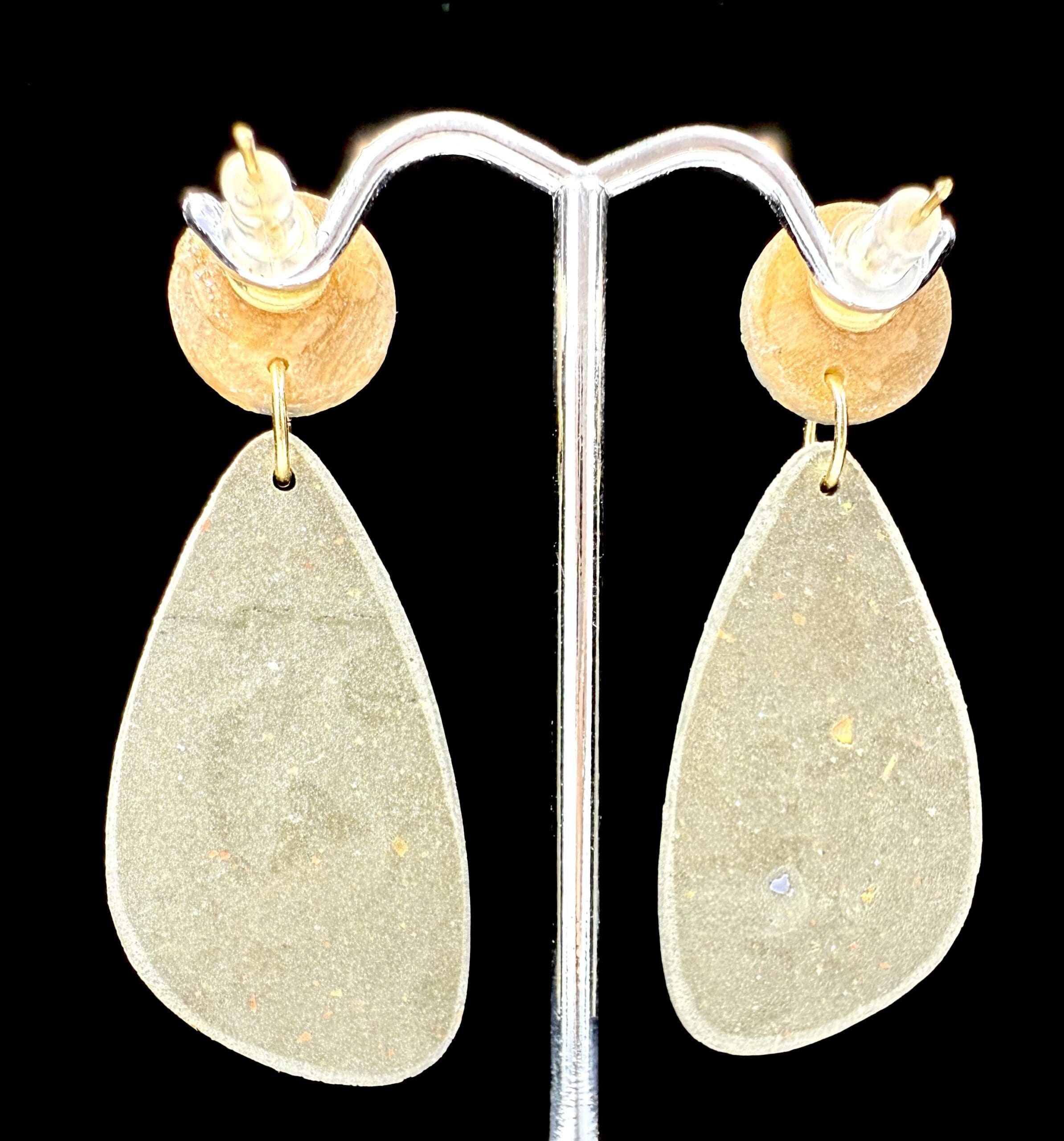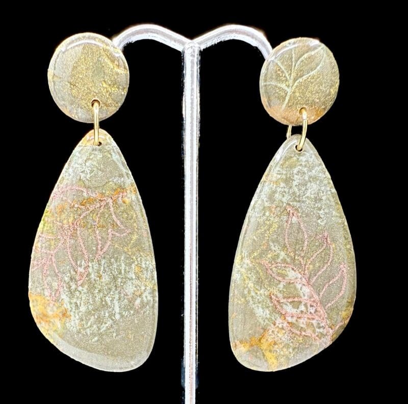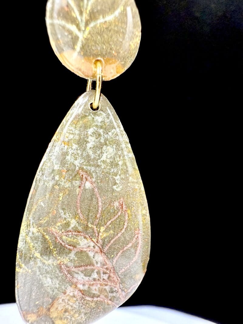 Golden Earth Collection – teardrop marquis polymer clay earrings in muted gold and pink tones with a high-gloss resin finish and gold-plated posts. Elegant, lightweight, and earthy.