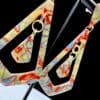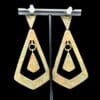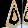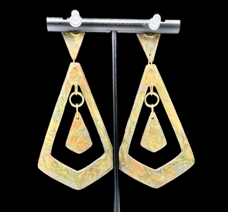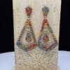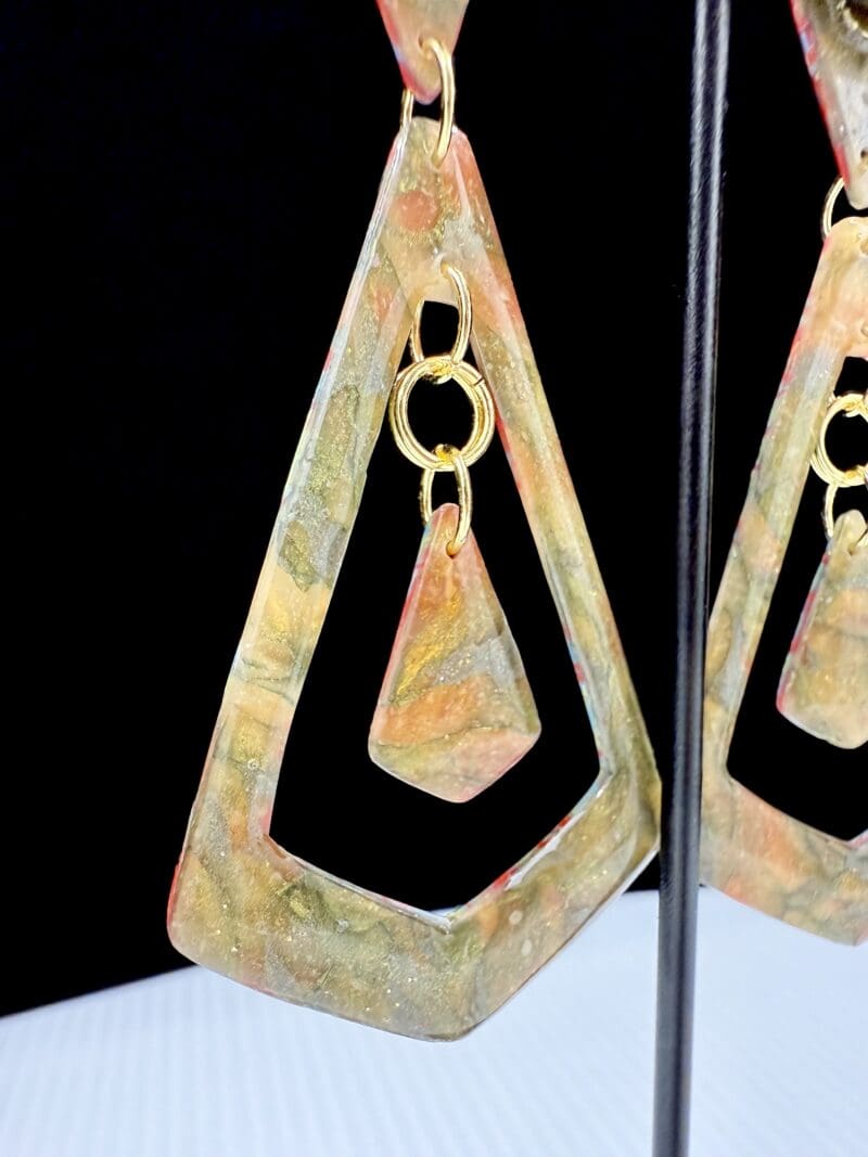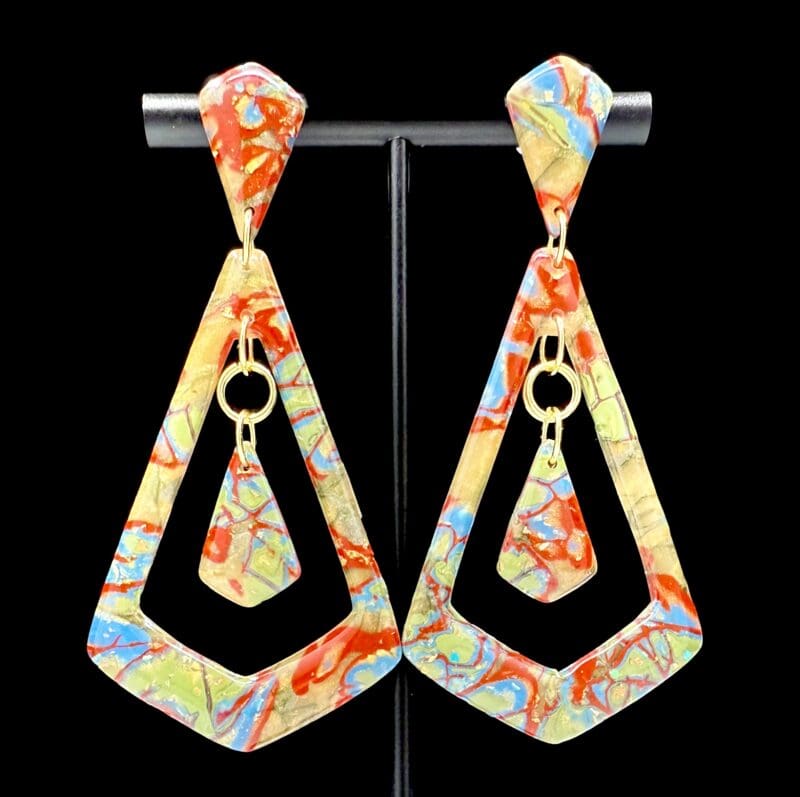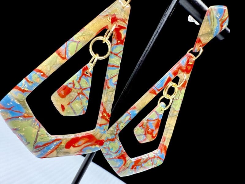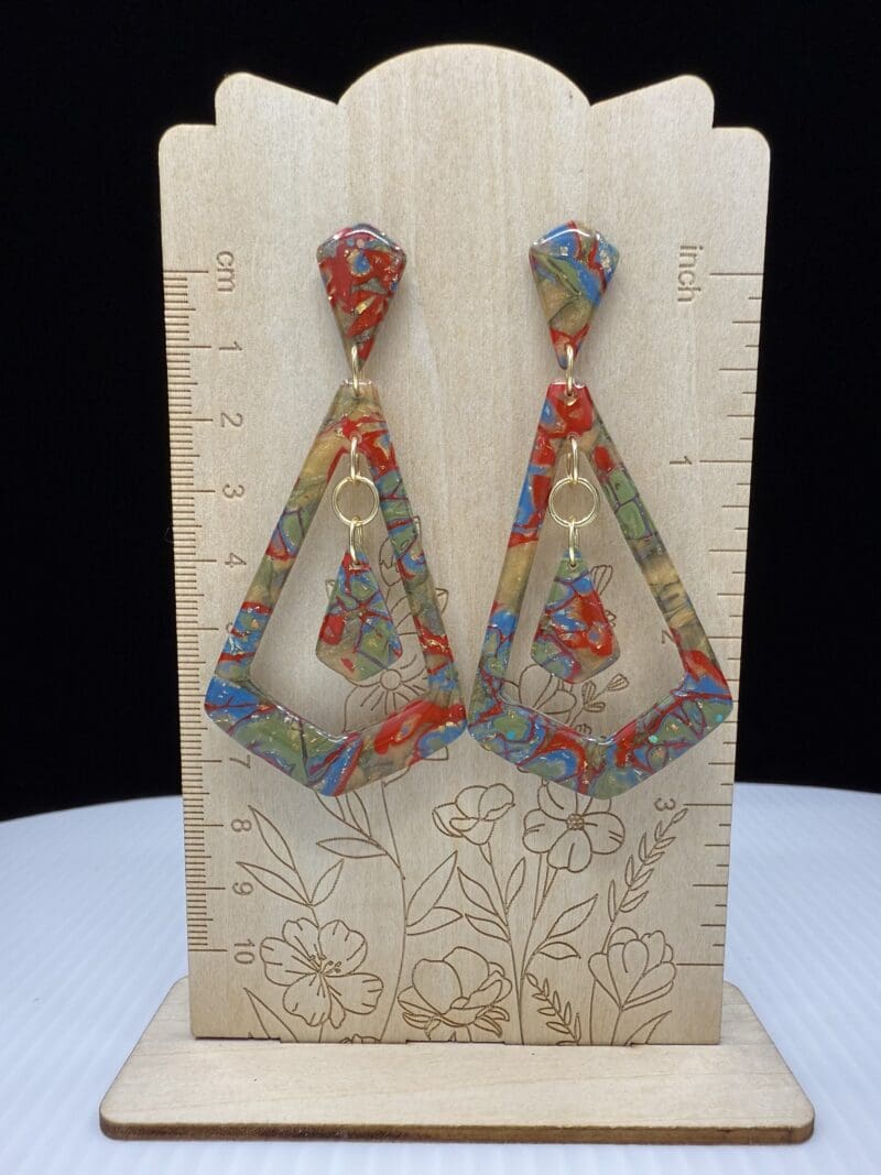 These chandelier-style earrings feature layered open geometric frames with a suspended inner drop, showcasing vibrant mokume gane scrap patterns. Rich reds, blues, greens, and soft gold tones create depth and movement throughout the multi-tiered design. The open structure keeps the look bold yet balanced, allowing light to move through each layer. See them in natural sunlight here: https://www.facebook.com/share/r/1Fxfvz3QLy/