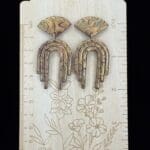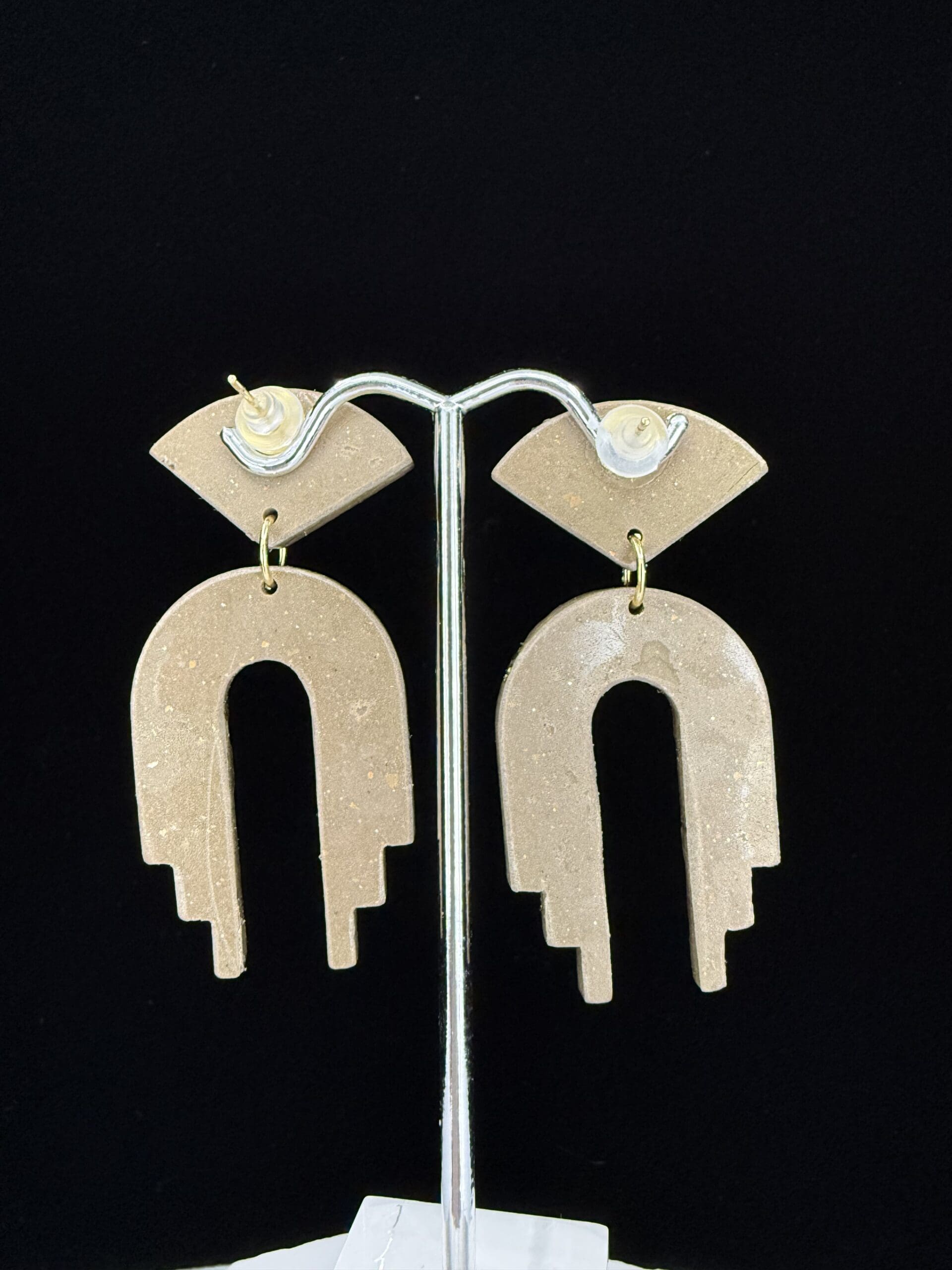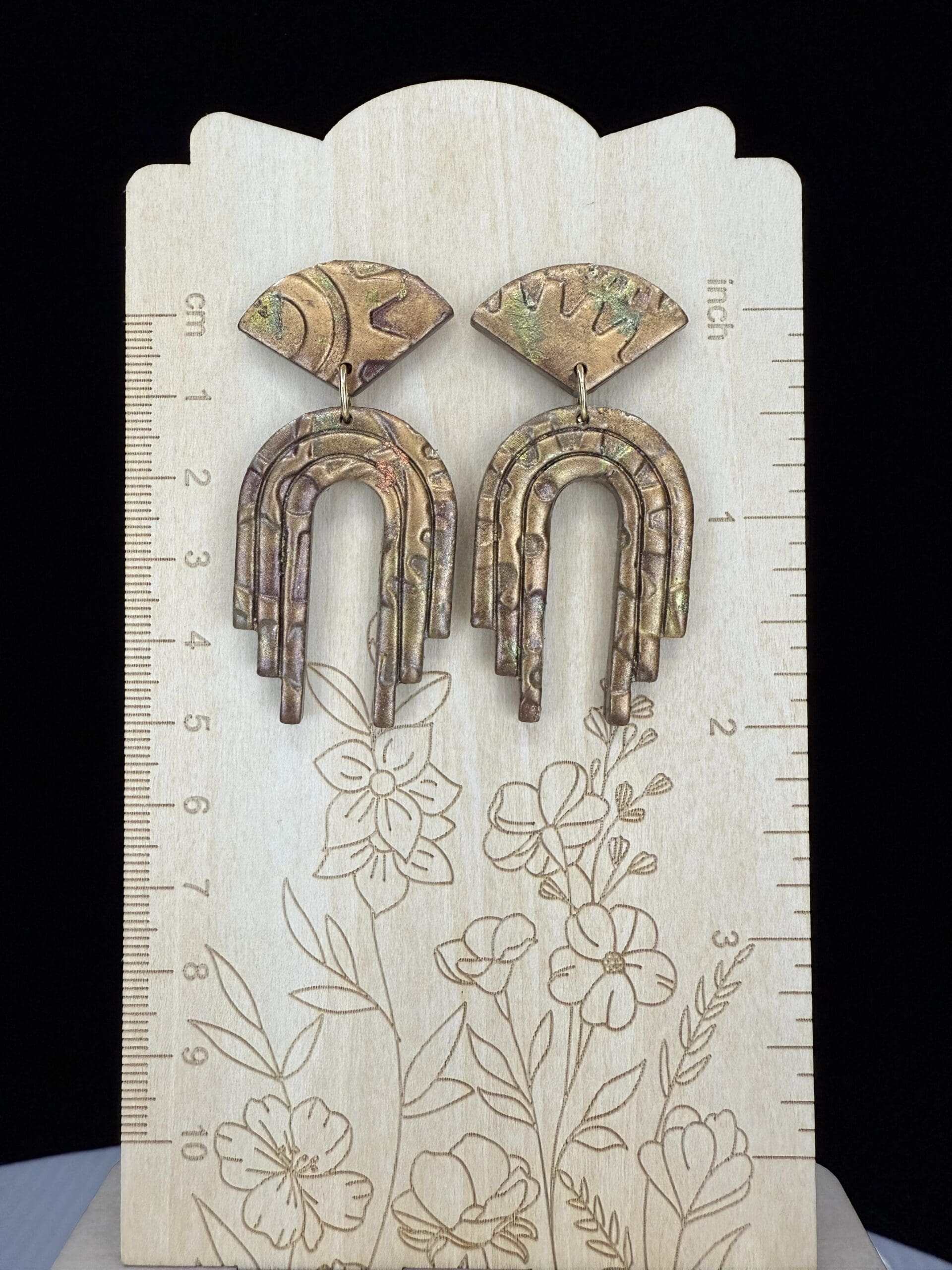 From the Industrial Punk Collection, these U-arch earrings combine structured form with the raw charm of metallic texture. Each earring features a fan-shaped top and layered arch base, embossed with hand-carved industrial patterns, brushed in antique bronze-gold, and finished with a fine sheen gloss for subtle depth and reflection.