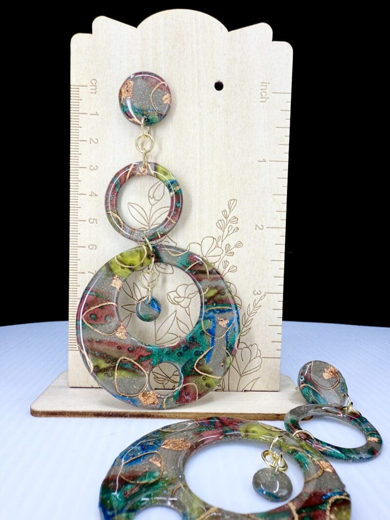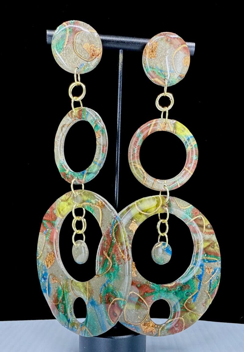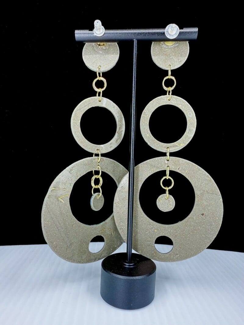 These statement earrings feature a bold stacked circular construction with open rings and suspended inner accents, creating depth and movement without visual heaviness. The design combines mixed earthy tones with metallic detailing for a sculptural, industrial-art feel. Lightweight despite their scale, they deliver strong impact with balanced geometry. See them in the natural sunlight here: https://www.facebook.com/share/r/1BeEwNJ9Vh/