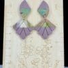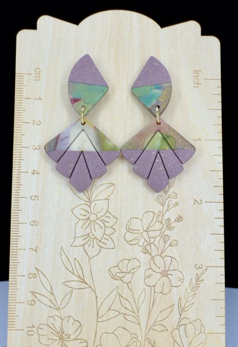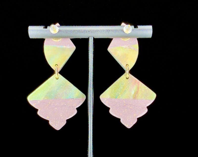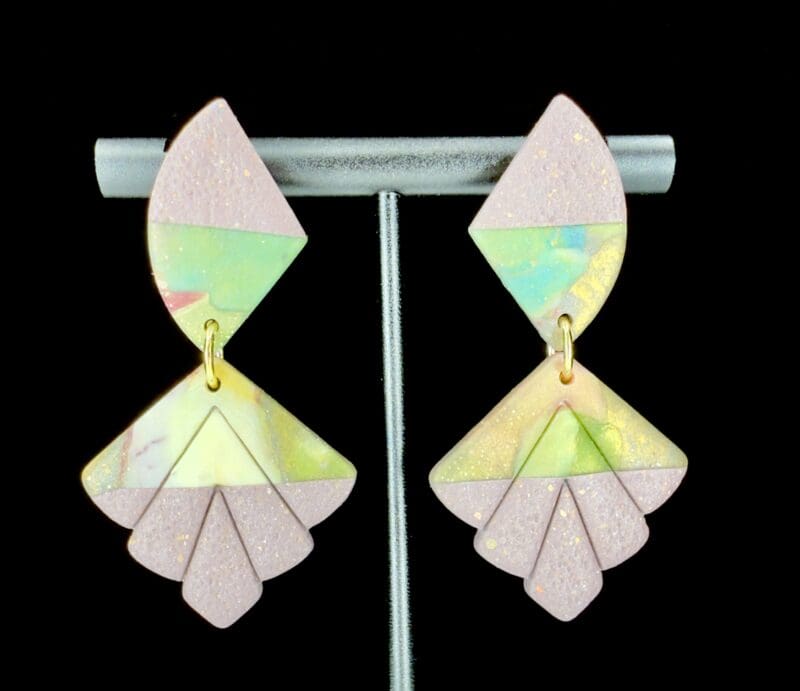 Soft pastel marbling flows across geometric diamond and fan shapes, creating a sculptural silhouette with layered movement. These lightweight statement earrings combine angular structure with delicate color transitions, giving you bold style without heaviness.