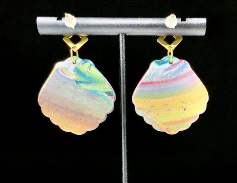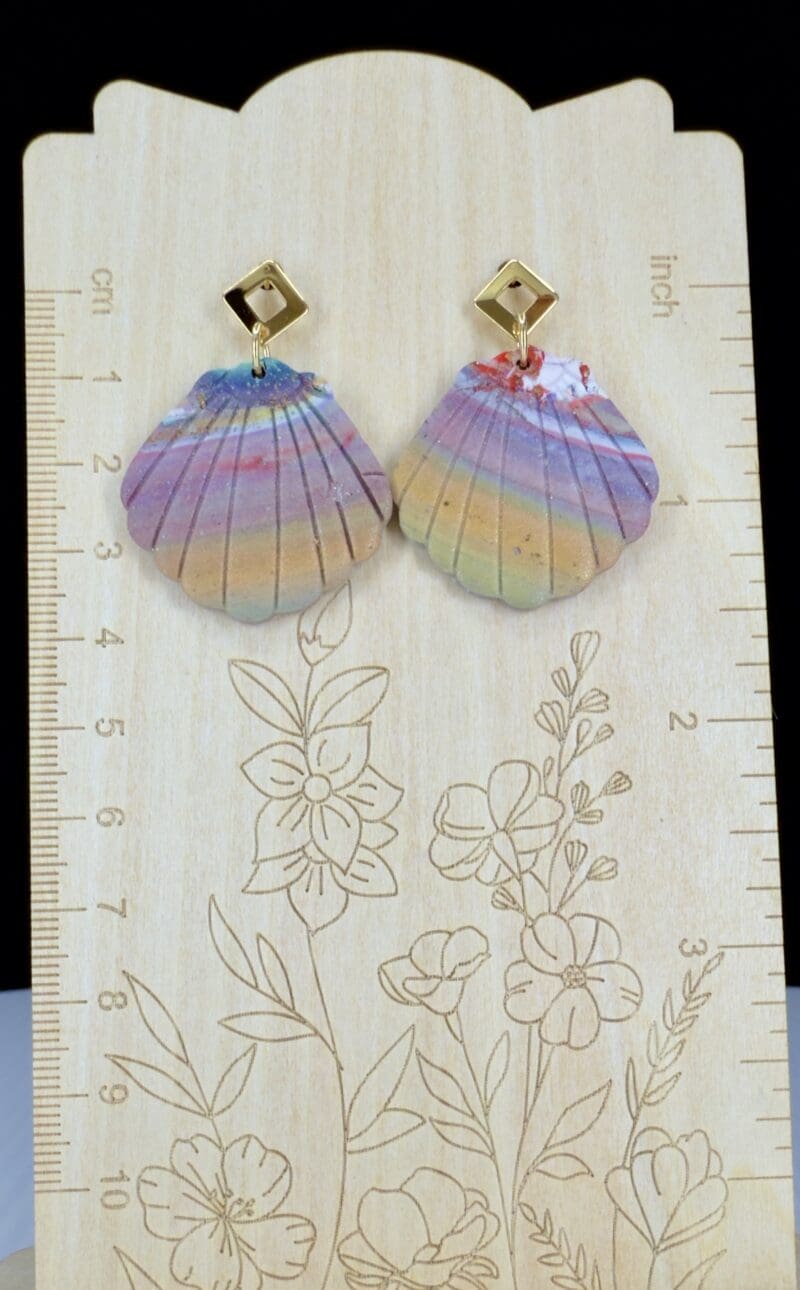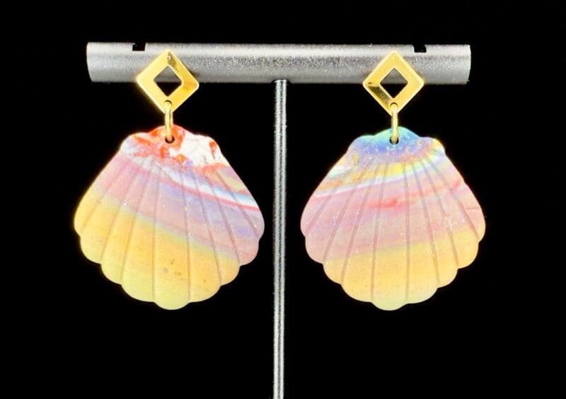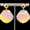 Soft sunset tones sweep across scalloped shell shapes, blending pastel pink, golden yellow, coral, and hints of aqua in a smooth marbled finish. These lightweight earrings bring a warm, coastal-inspired glow while remaining easy and comfortable to wear all day.