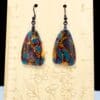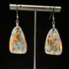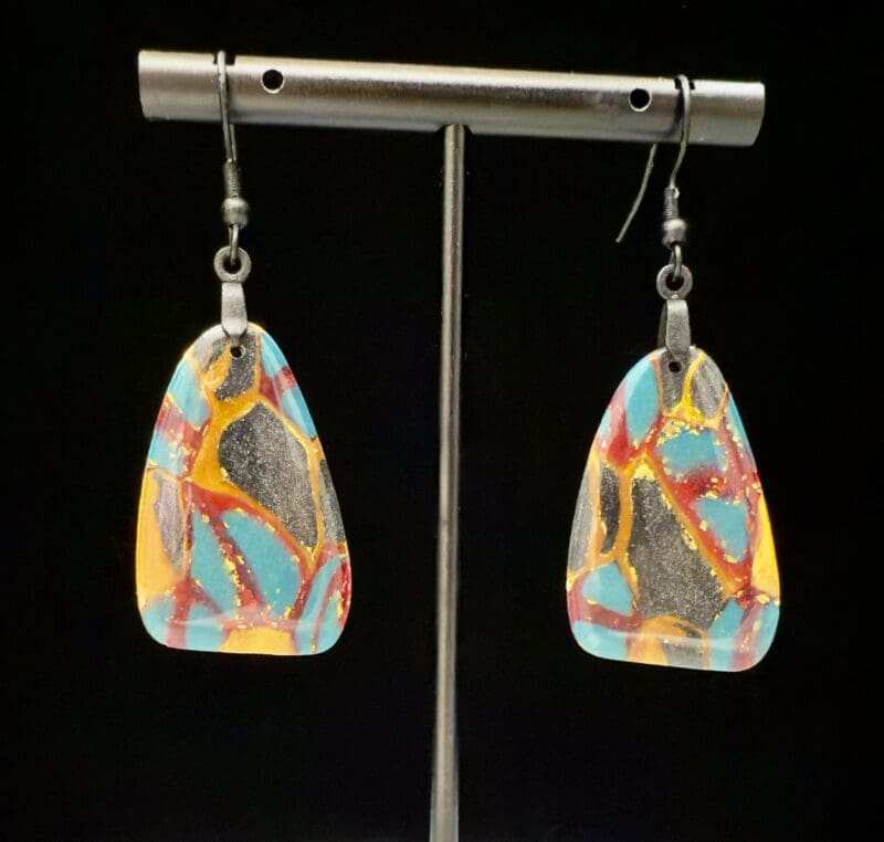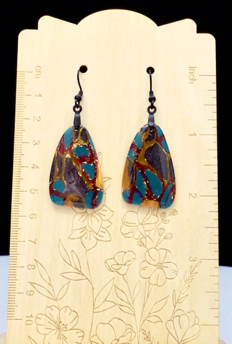 Rounded trapezoid dangle earrings featuring an abstract mosaic-style surface composed entirely of clay. Teal, rust, charcoal, and warm gold-toned accents create contrast and depth against a darker base, giving each piece strong visual presence. Compact in size and lightweight, this silhouette offers bold color with a grounded, architectural feel. See this clay mix in natural sunlight here: https://www.facebook.com/share/r/1EjtBKL4R5/