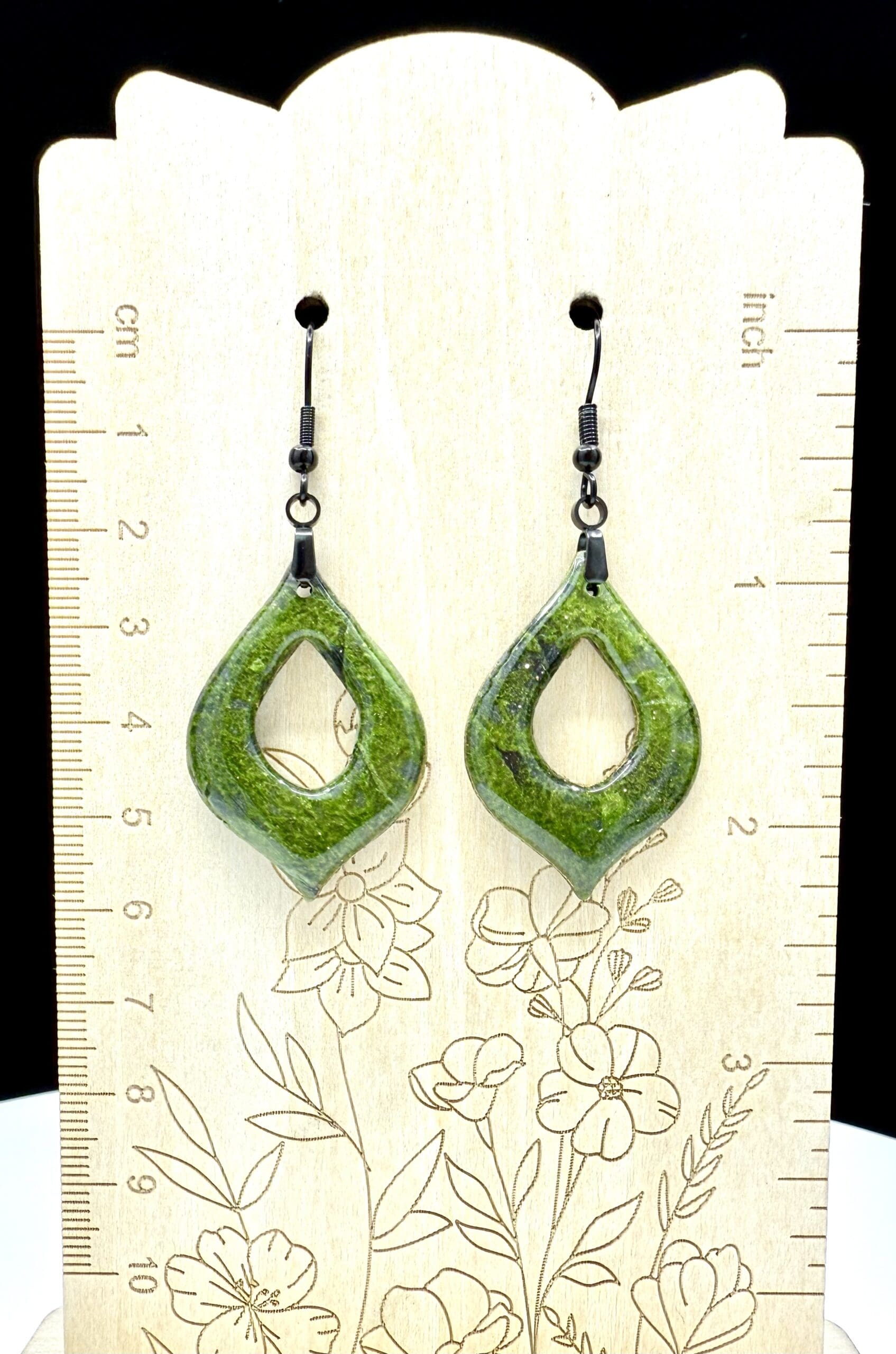 Moss Under Glass Collection – open marquis teardrop polymer clay earrings in deep moss green with a glasslike resin finish and black hooks. Lightweight, modern, and nature-inspired. See them in natural sunlight here: https://www.facebook.com/share/r/1Fb4ZhFob7/