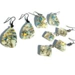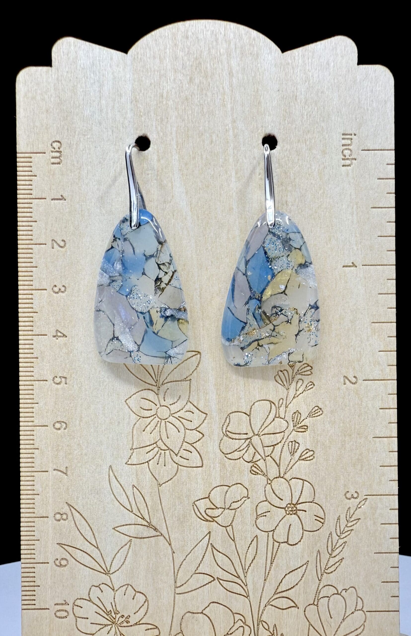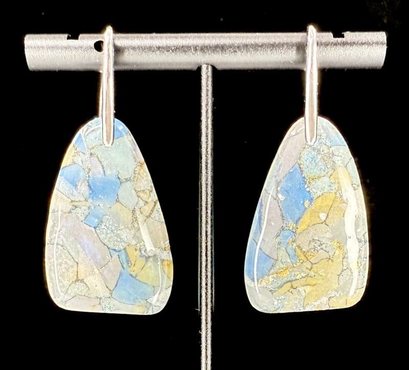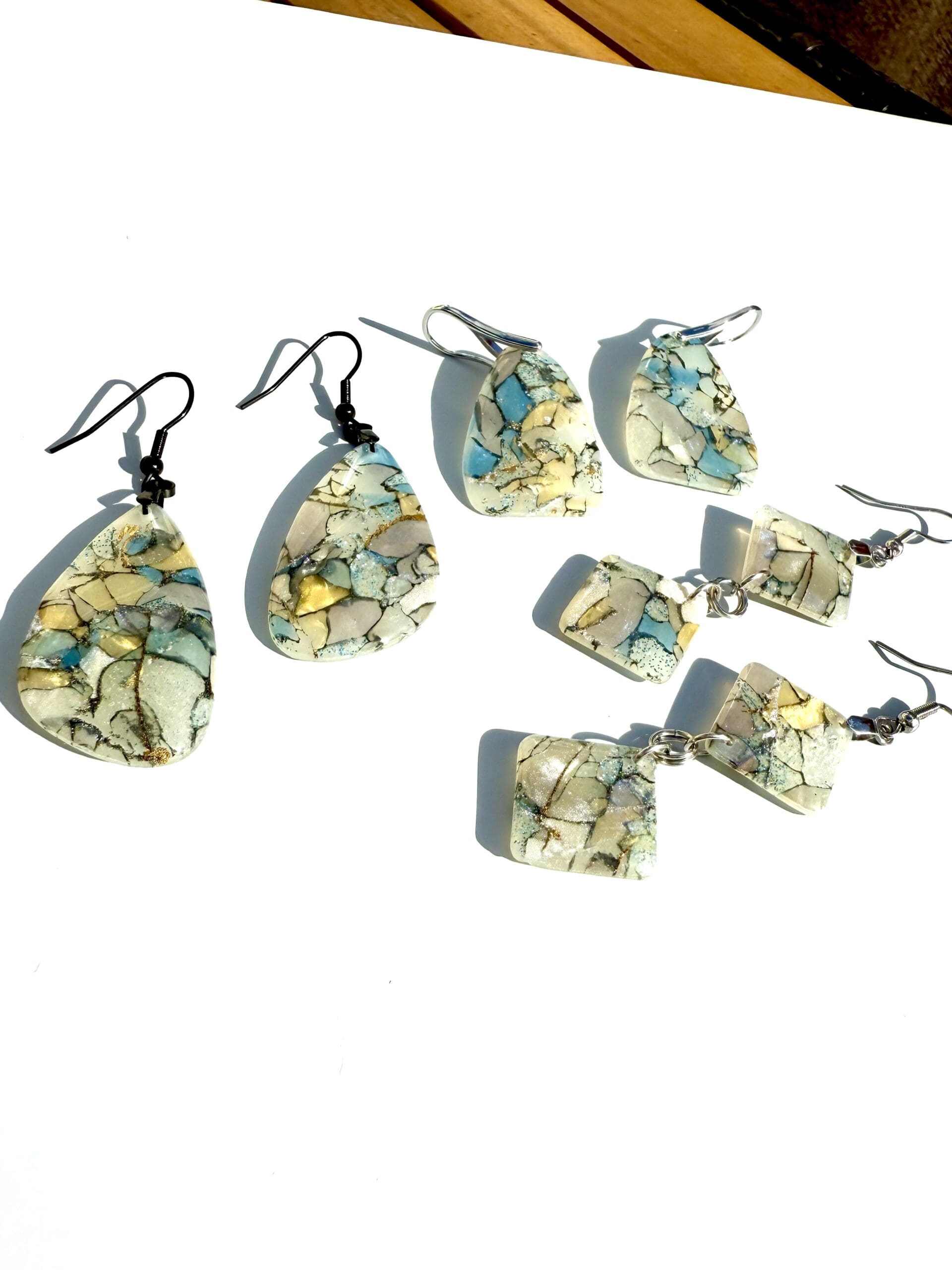 From the Ocean Pearl Drift Collection, these tapered trapezoid drops capture the opalescent glow of oyster shell—pearl, soft blue, cream and gold veining layered into a cracked-shell marbling. Each piece is sealed in resin on both sides to amplify the shimmer with a glass-like finish.