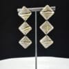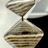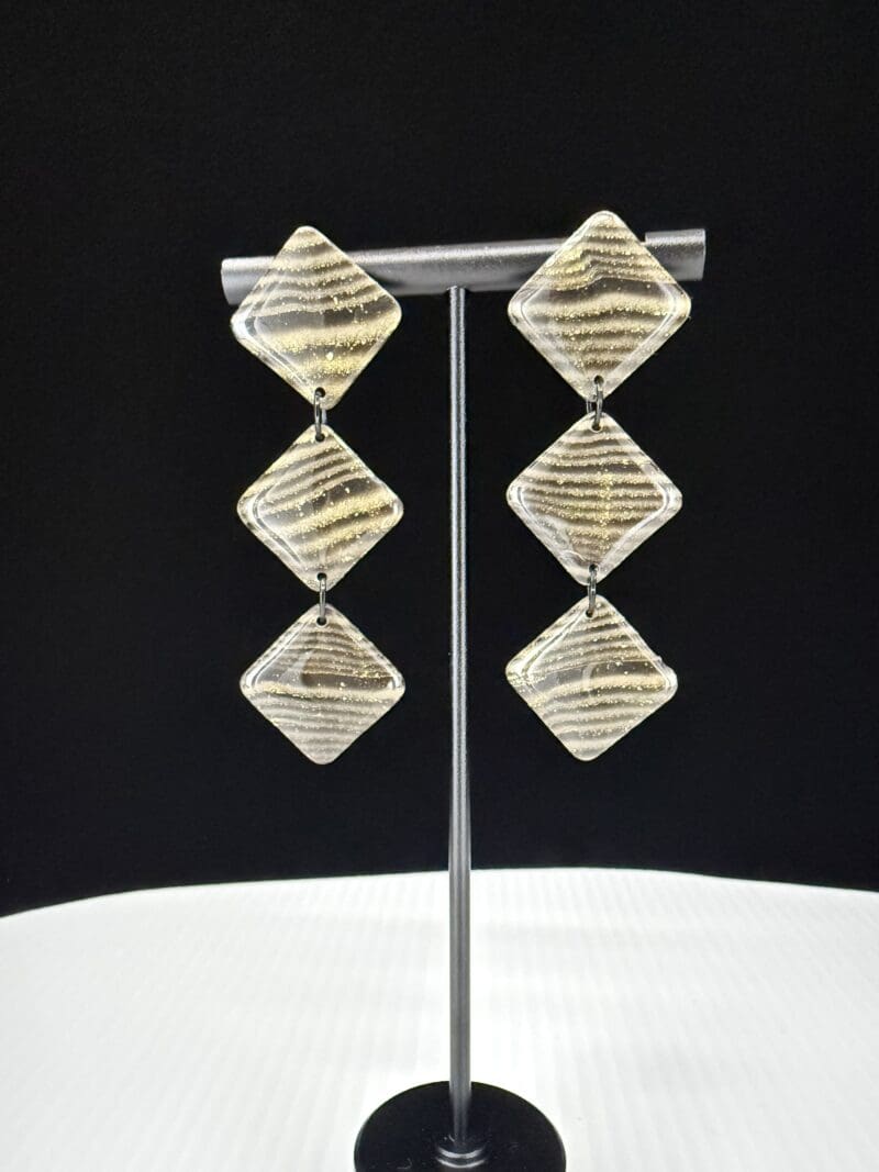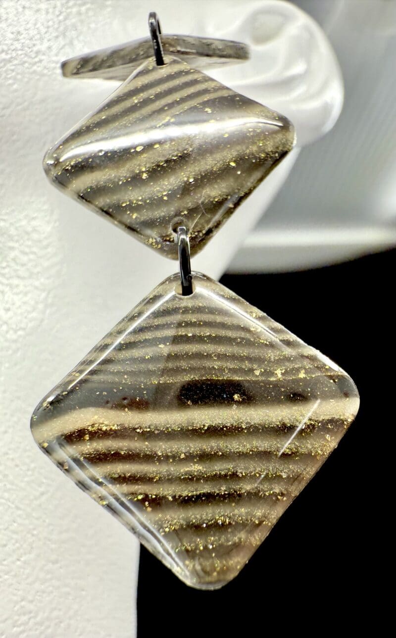 Dangle earrings featuring stacked diamond shapes with woodgrain and gold that creates a cat’s-eye effect when moved in the light.