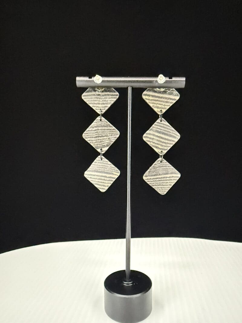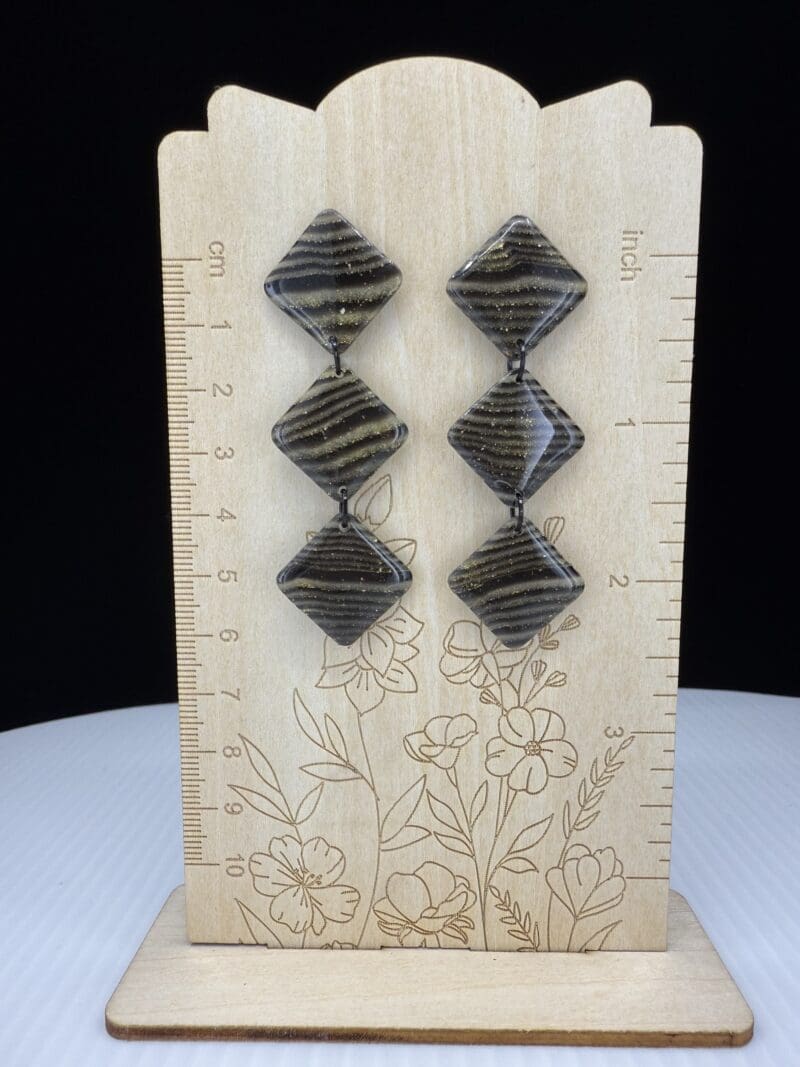 Onyx Woodgrain Triple Dimond Stack Dangle Earrings