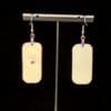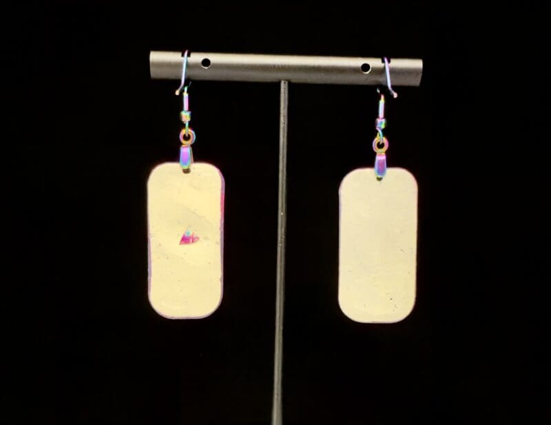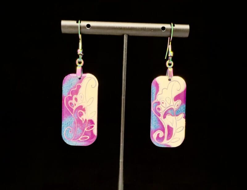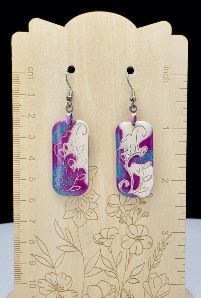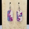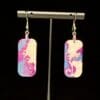 These rounded rectangle earrings feature the mokume gane technique with flowing layers of vivid pink, lavender, cream, and shimmering blue. The elongated rounded rectangle silhouette provides a clean modern frame while the layered mokume pattern creates organic movement across the surface.