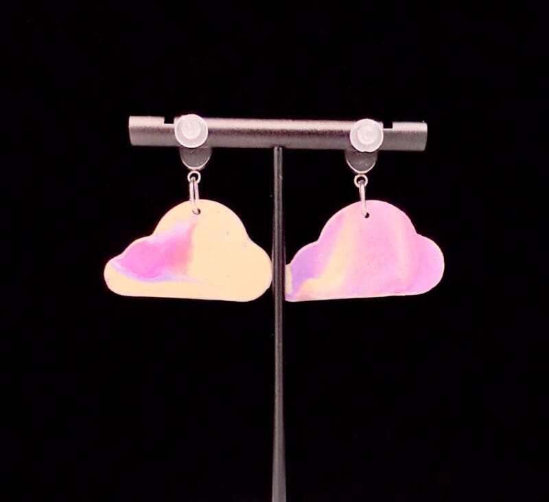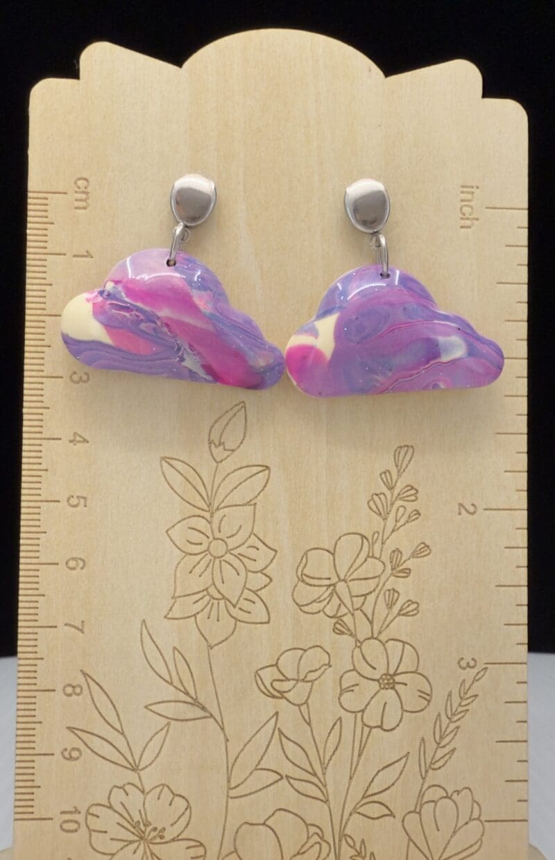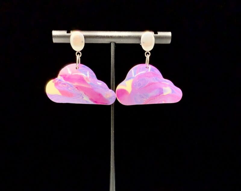 These cloud-shaped earrings feature a bold marbled blend of electric pinks, lavender, and soft cream tones, creating a dreamy storm of color. The organic cloud silhouette adds a playful, contemporary shape while the glossy resin finish intensifies the swirling movement inside the clay. Lightweight hollow construction keeps the statement size comfortable for all-day wear.