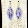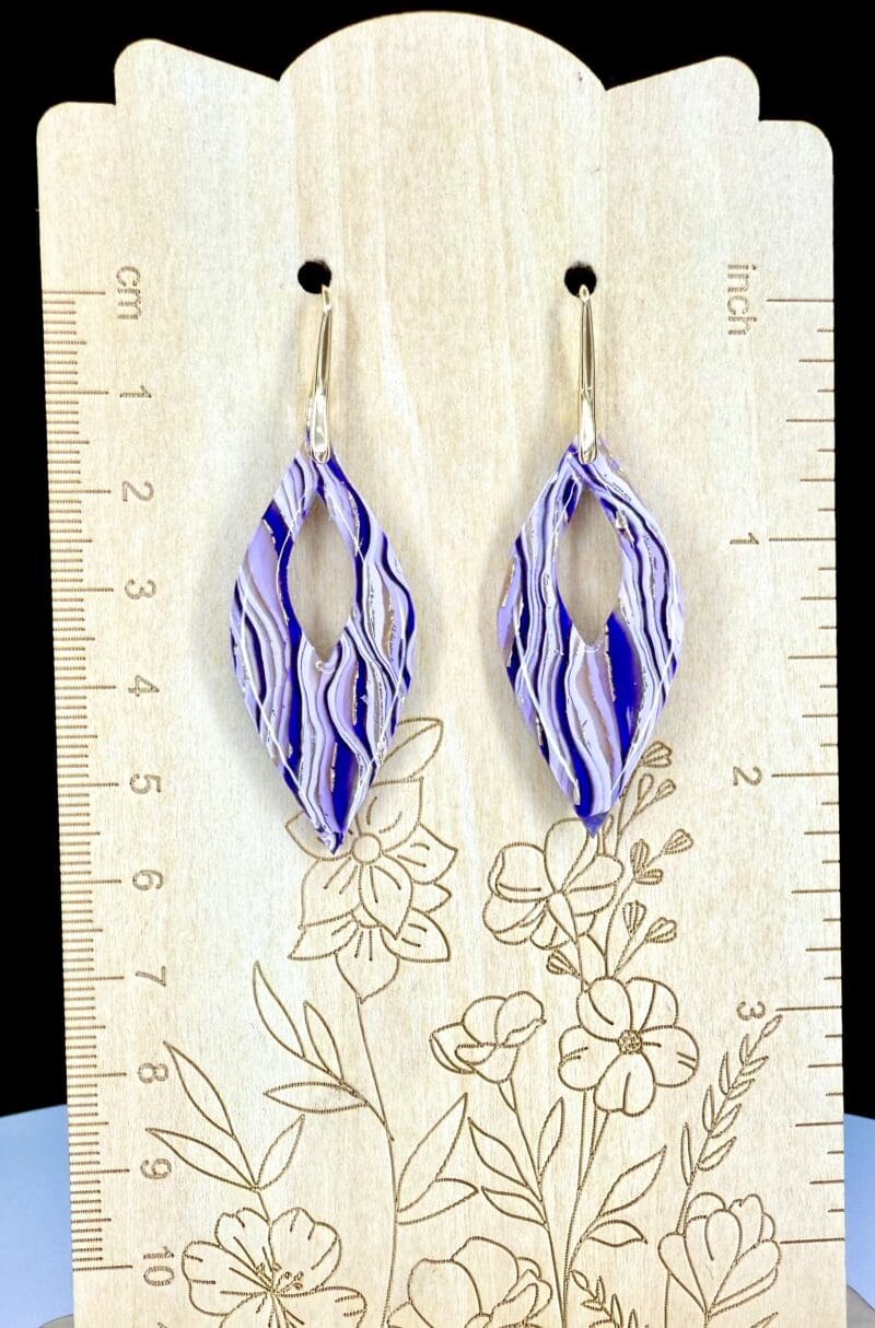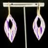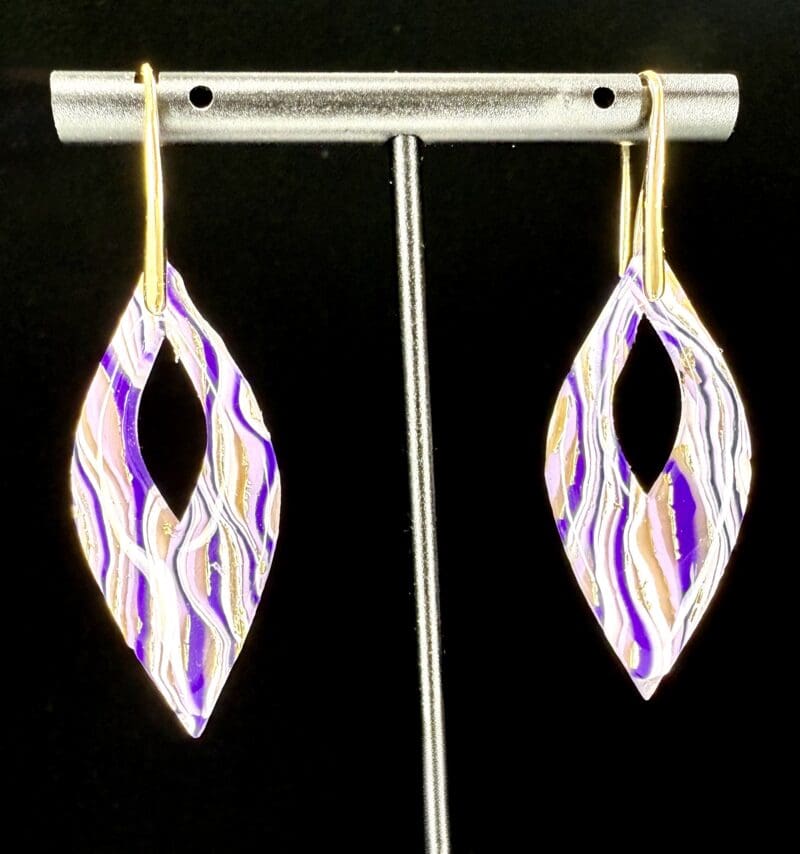 Open-marquise polymer-clay earrings in violet, pearl, and blush zebra stripes with gold leaf and gold-plated hooks. Glossy resin front, natural back, 2.7 in long, ultra-light.