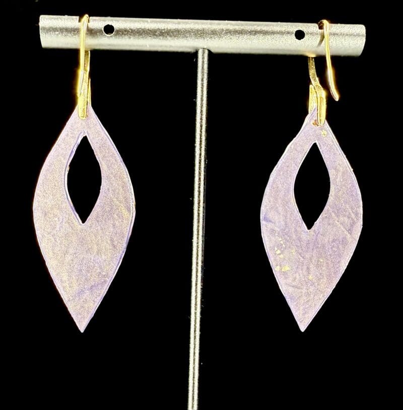 Each earring is hand-layered with vivid violet, pearl, and soft blush clay infused with real gold metal leaf, creating natural metallic veining through every curve. The front is sealed in a high-gloss resin for amplified color and reflection, while the back remains natural to preserve the authentic clay texture.