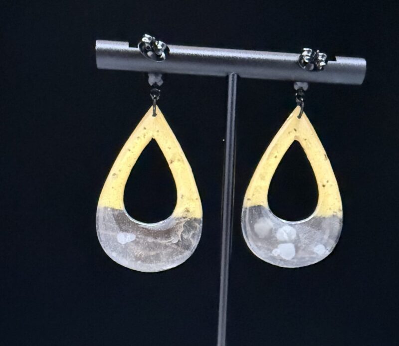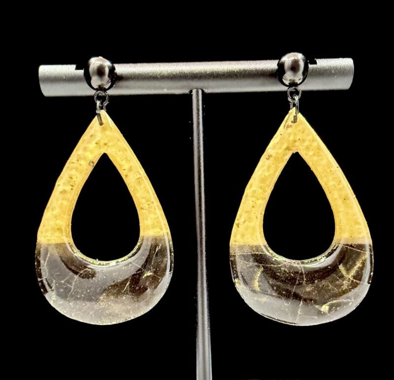 This open teardrop design features a bold black and gold contrast with a smooth, high-gloss finish for a clean retro statement. The lightweight silhouette offers subtle movement while maintaining a strong, sculptural presence.