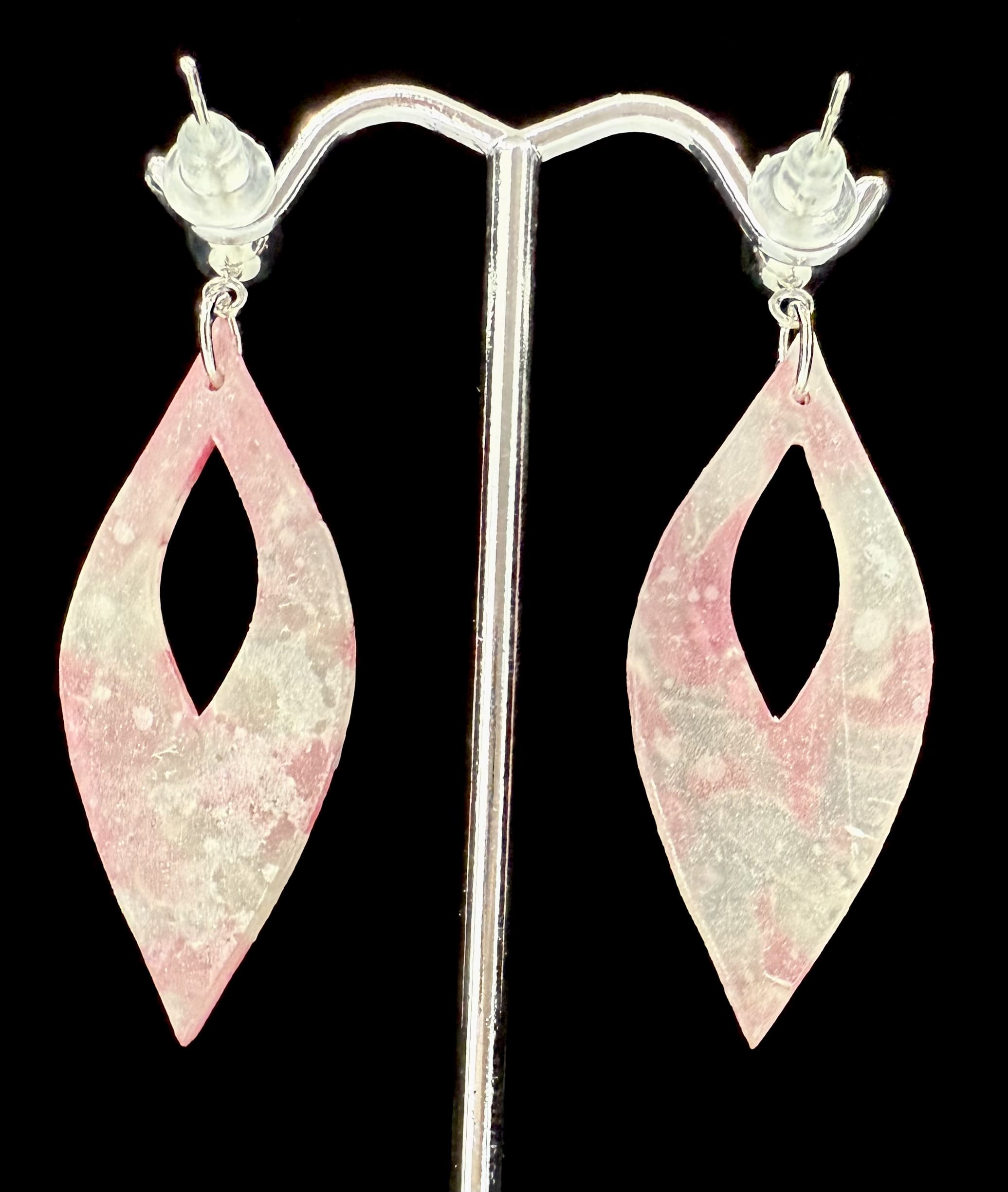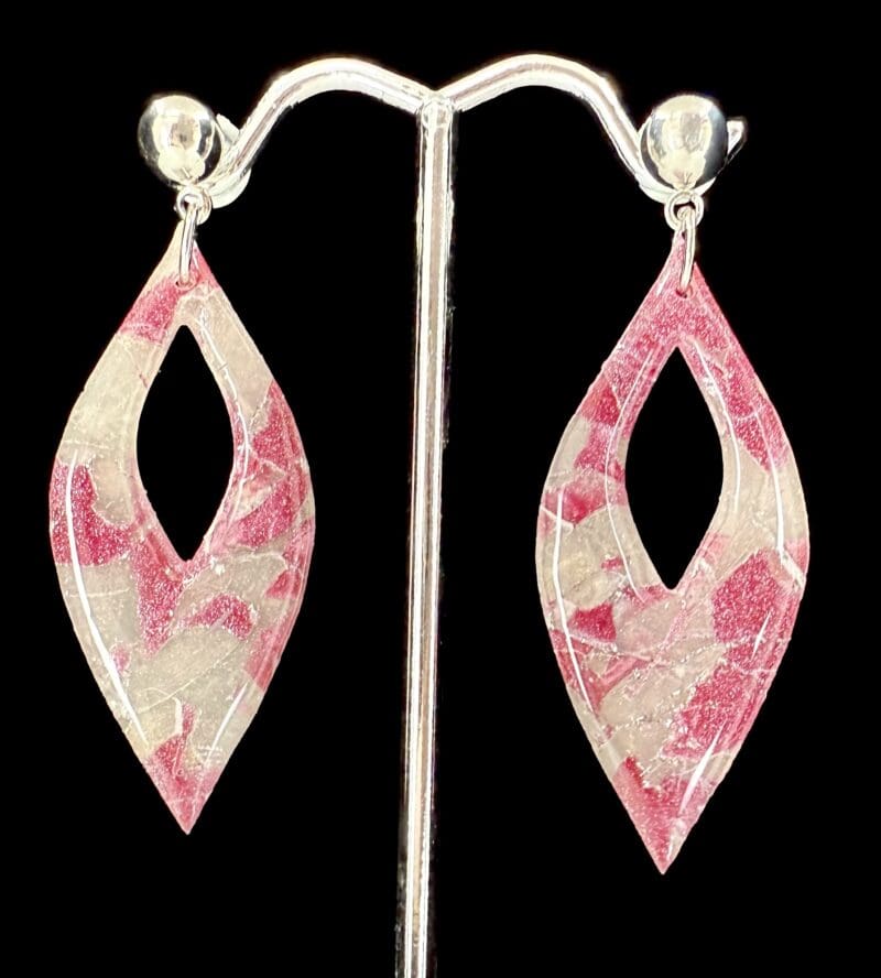 Sleek and shimmering, these Rosé Iced Opal earrings feature marbled blush and opal tones in a polished resin finish. Just 2.04 g per earring — refined shine without the weight. See them in natural sunlight here: https://www.facebook.com/share/r/1W6xZqVZQT/?mibextid=wwXIfr