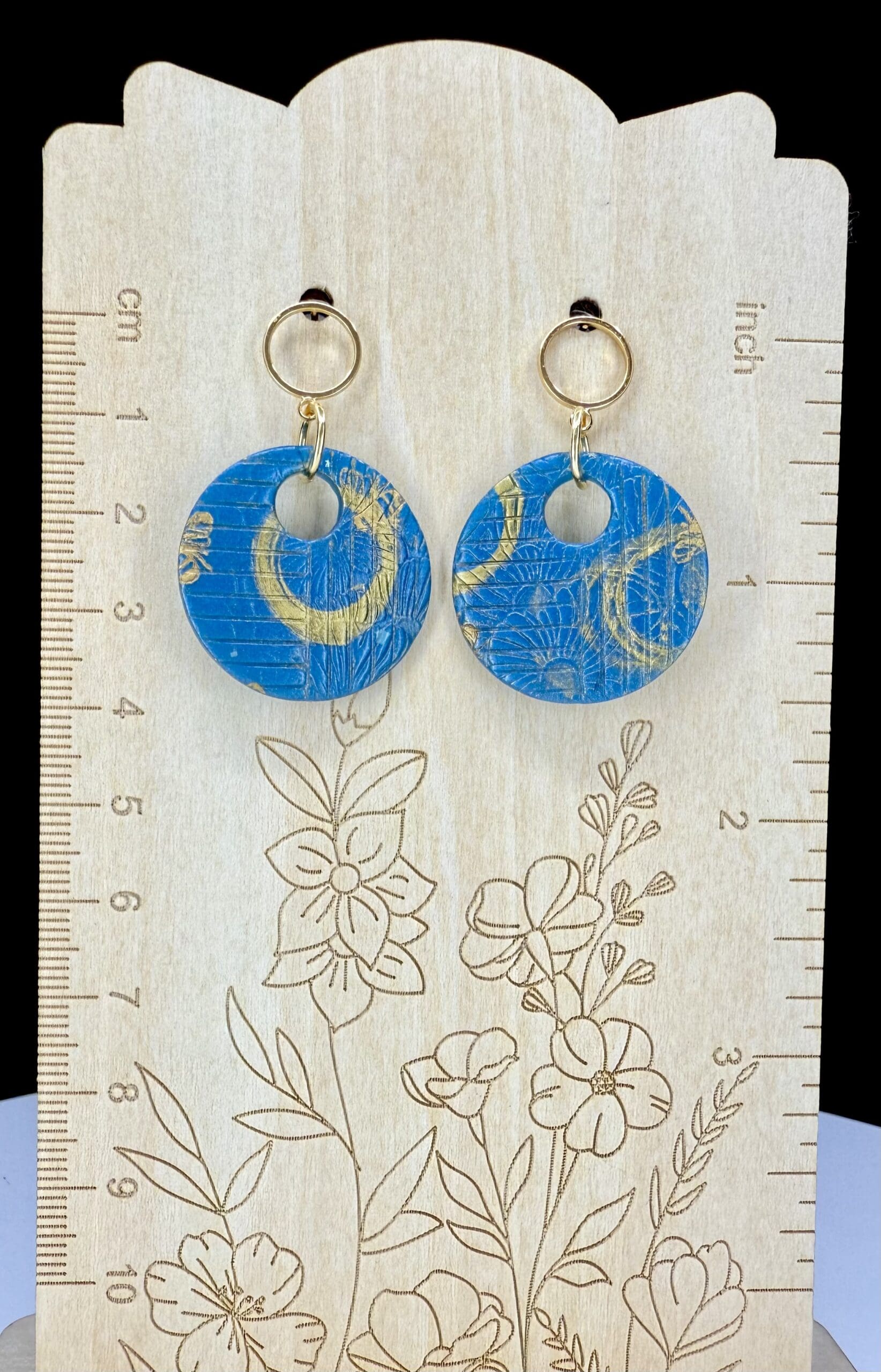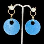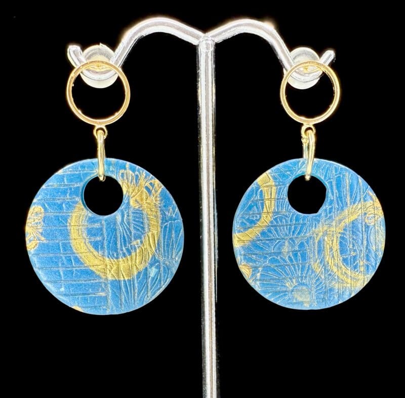 Sky-bright blues, golden bees, and a modern open-disc silhouette — lightweight earrings with a luminous light gloss finish. See them in the sunlight here: https://www.facebook.com/share/r/17AHWyDGiV/?mibextid=wwXIfr